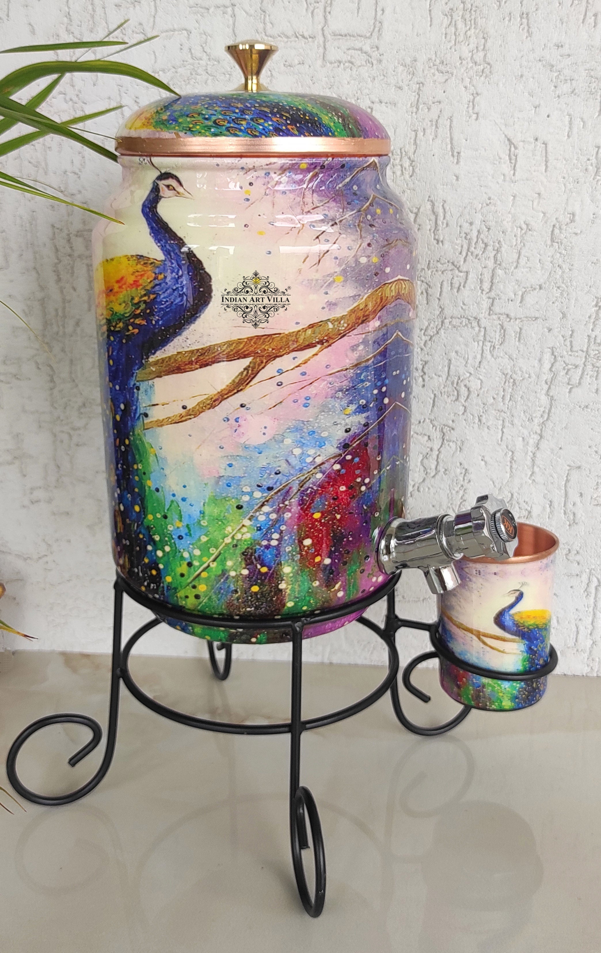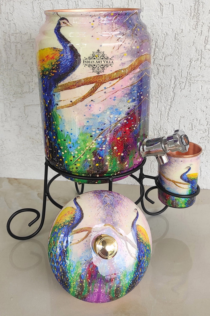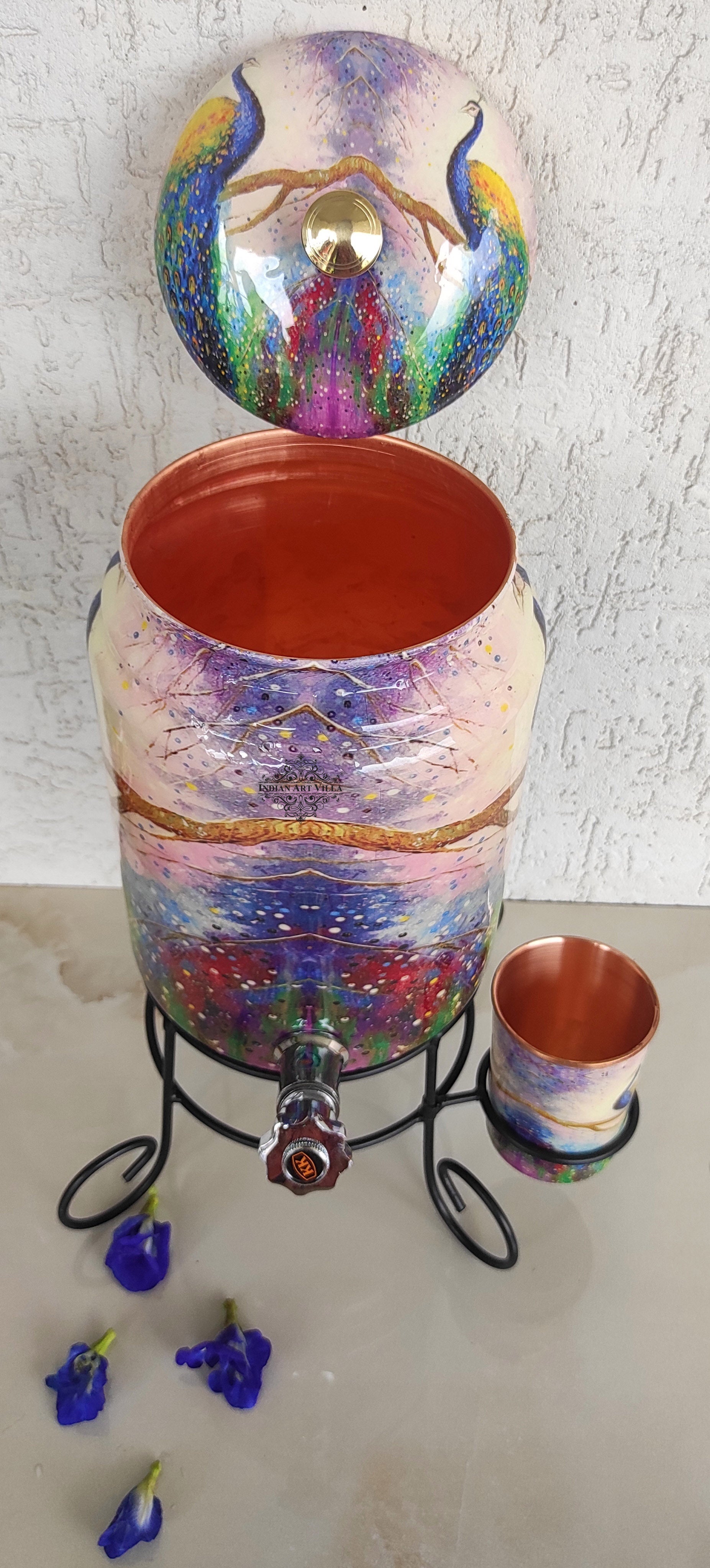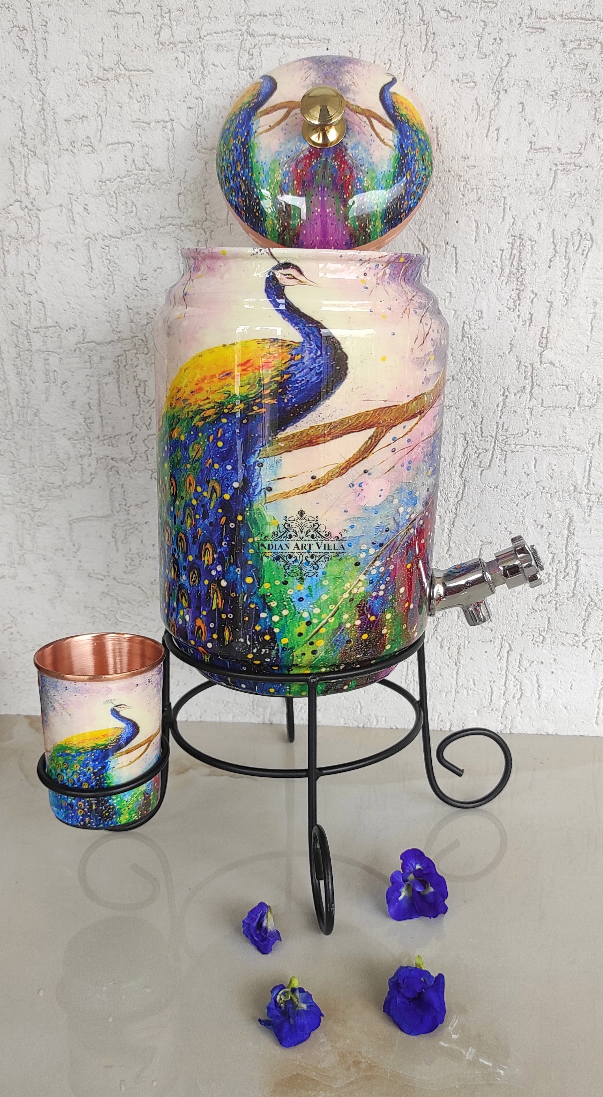 Indian Art Villa Copper Colorful Peacock Printed Design Water Pot With Stand & Glass 5 Litres