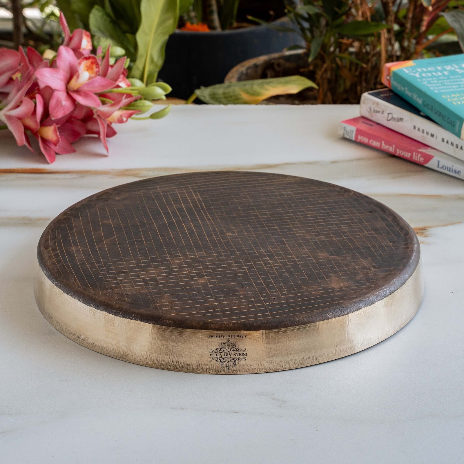 INDIAN ART VILLA Bronze Thali Plate Centre Design, Black Back, Dia 12 Inch