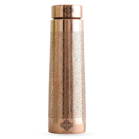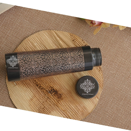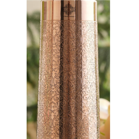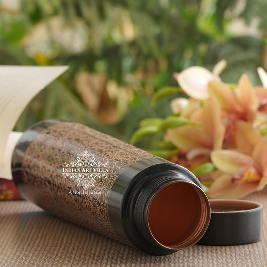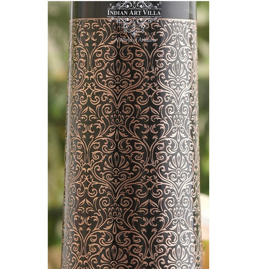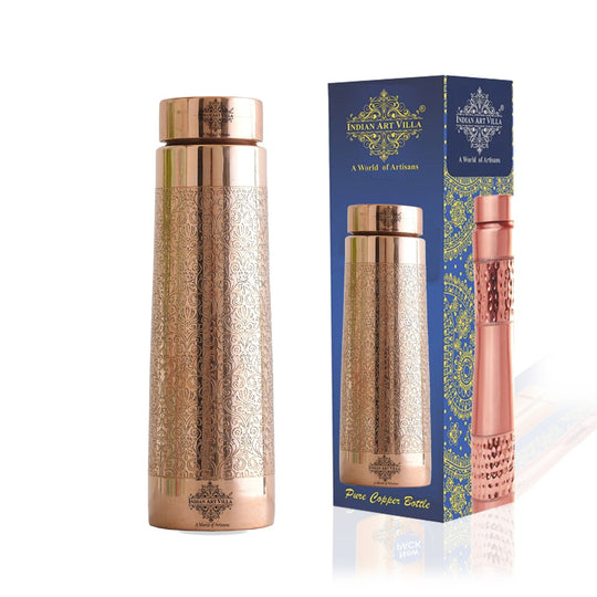 Indian Art Villa Handcrafted Pure Copper Pyramid Shape Embossed Design Bottle, with a capacity of 825 ML, epitomizes the fusion of traditional artistry and practical functionality. The bottle features a unique pyramid shape, which is both aesthetically pleasing and ergonomic. The intricate embossed design showcases the exceptional skills of Indian artisans, making each bottle a piece of art. Copper is known for its numerous health benefits. Drinking water stored in a copper vessel can improve digestion, enhance immunity, and provide antimicrobial properties. Indian Art Villa Handcrafted Pure Copper Pyramid Shape Embossed Design Bottle is not just a container for your drinks; it's a blend of health, beauty, and tradition. Its unique design, coupled with the health benefits of copper, makes it an indispensable part of a healthy and stylish lifestyle. The bottle comes with a secure, leak-proof lid, making it ideal for carrying in bags without the worry of spills. Its design ensures that your beverages remain contained and fresh throughout the day.