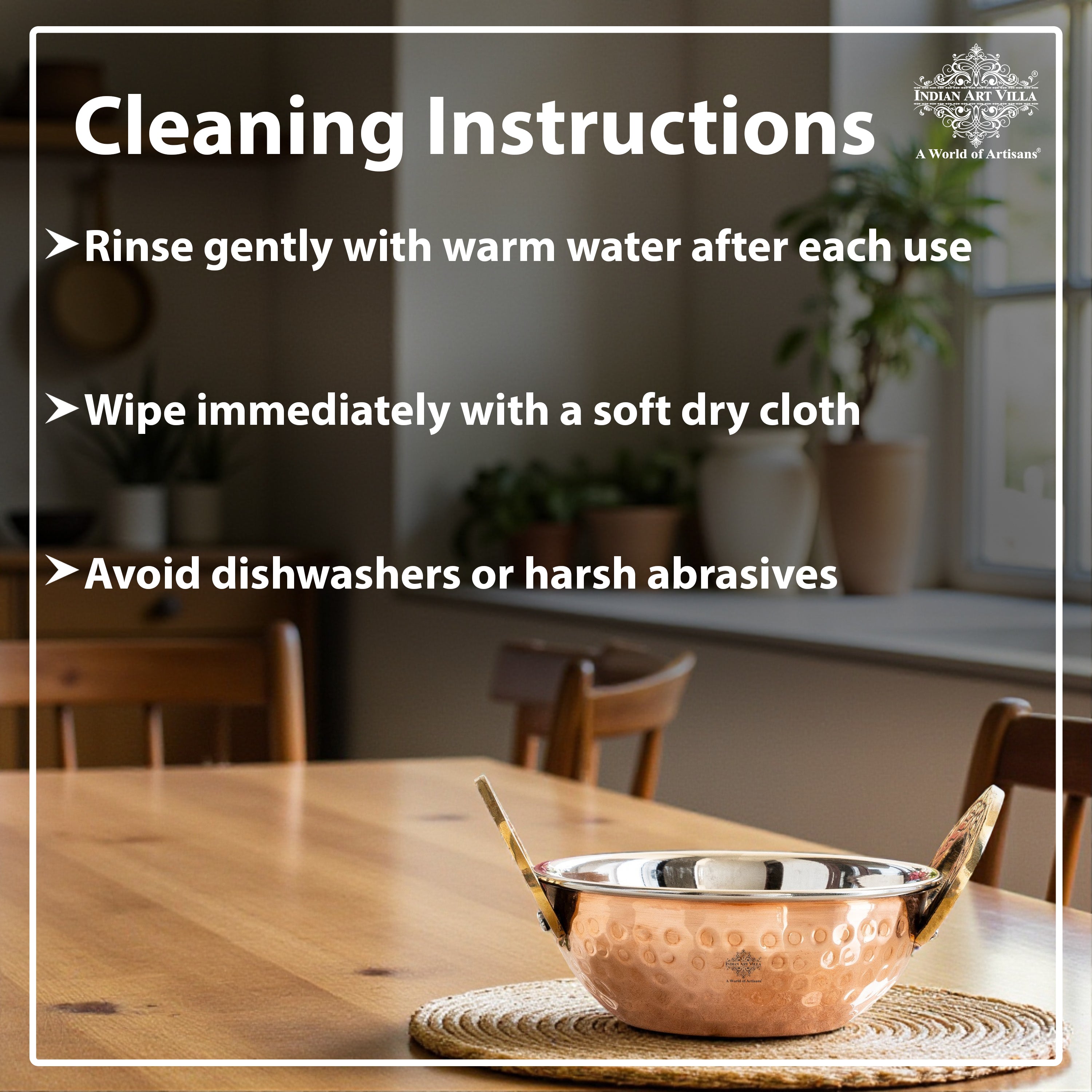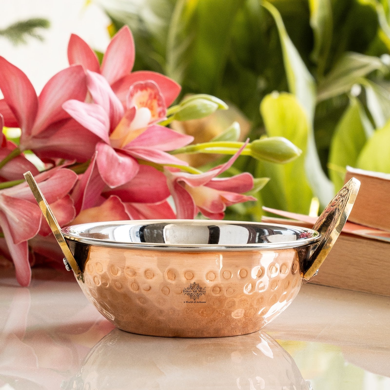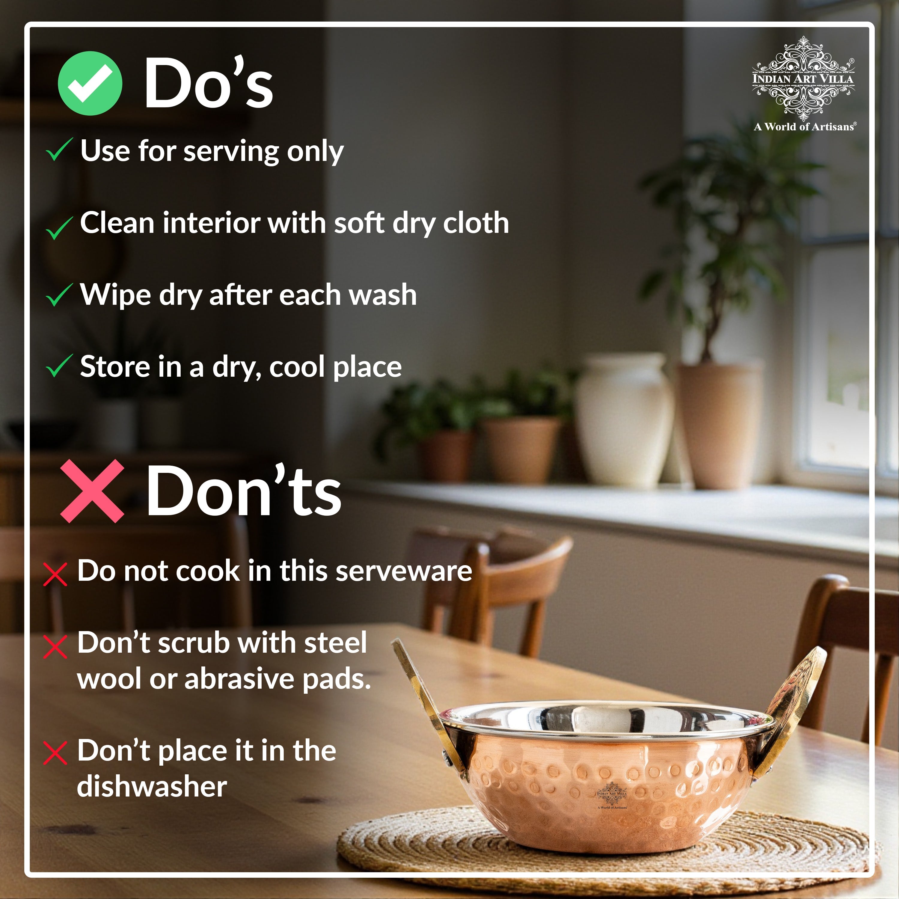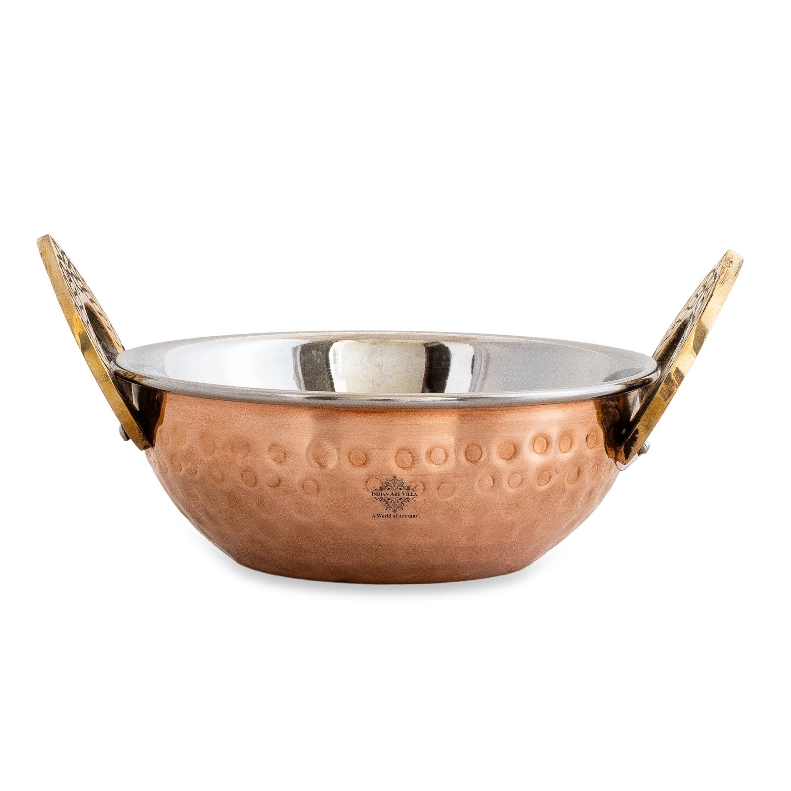 Indian Art Villa Presents Best Quality Pure Hammered Steel Copper Kadhai with a capacity of 200 ml, 350 ml, 500 ml, 700 ml, 900 ml, 1000 ml, 2250 ml, Enhance your dining experience with the Steel Copper Hammered Kadhai, a masterpiece of traditional craftsmanship and modern elegance. This kadhai, with its hammered design and polished copper exterior, is not just serveware but a statement piece for your table. Perfectly designed for serving a variety of dishes, this 7.5-inch-wide kadhai is ideal for curries, gravies, stir-fries, and other delicacies. The sturdy brass handles are engraved with intricate patterns, providing a secure grip and adding a regal touch to its aesthetic. Specifically intended for serveware purposes, This kadhai is a versatile addition to your kitchen, elevating everyday meals and festive gatherings alike. Whether hosting a family dinner, celebrating a special occasion, or looking for the perfect gift for housewarmings, weddings, or festivals, this kadhai is sure to impress. Easy to clean and maintain, its stainless steel interior resists stains, while the copper exterior brings the warmth of tradition to your table. The Steel Copper Hammered Kadhai is durable, and elegant solution for serving meals with style and grace.