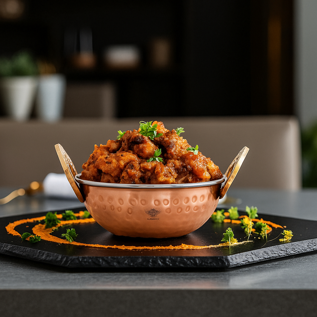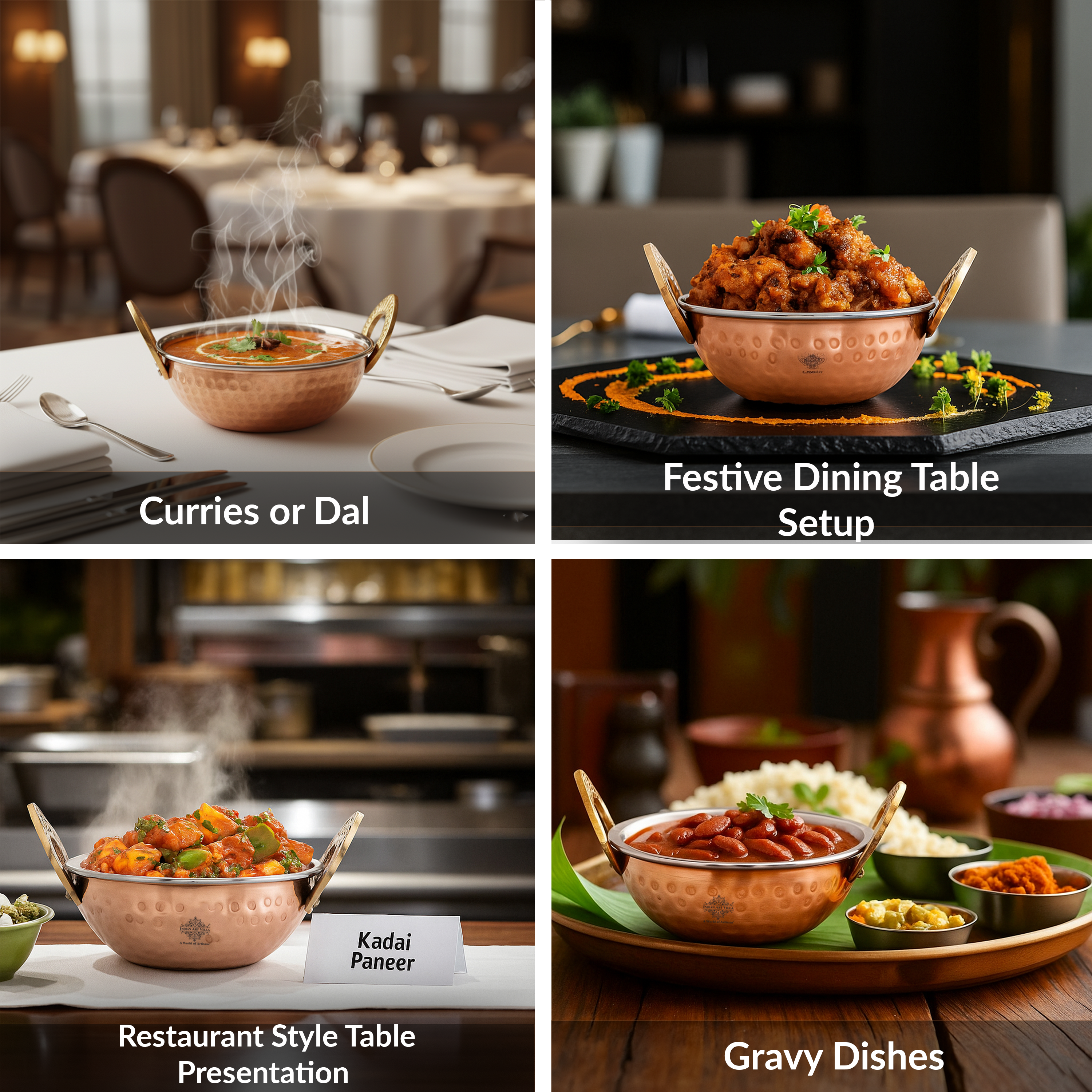 Elegant Traditional Design: This Steel Copper Hammered Kadhai features a stunning hammered design and polished finish, enhancing the aesthetics of your dining table while showcasing traditional Indian craftsmanship.