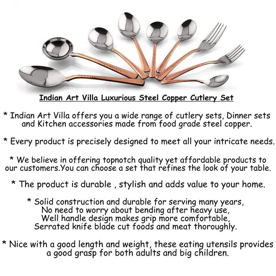 Even the smallest changes in your utensil collection can make a huge difference in your overall eating experience when you replace your ordinary spoons and forks with the elegant Copper Cutlery offered by Indian Art Villa. Surf from a wide collection of spoons, knifes and forks made of Copper by checking out the list below and order your favorite collections anywhere from India to get them delivered to you.