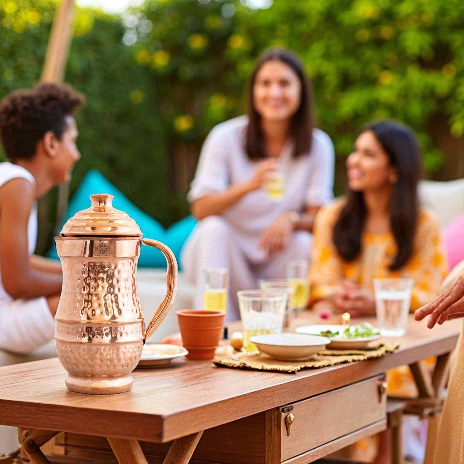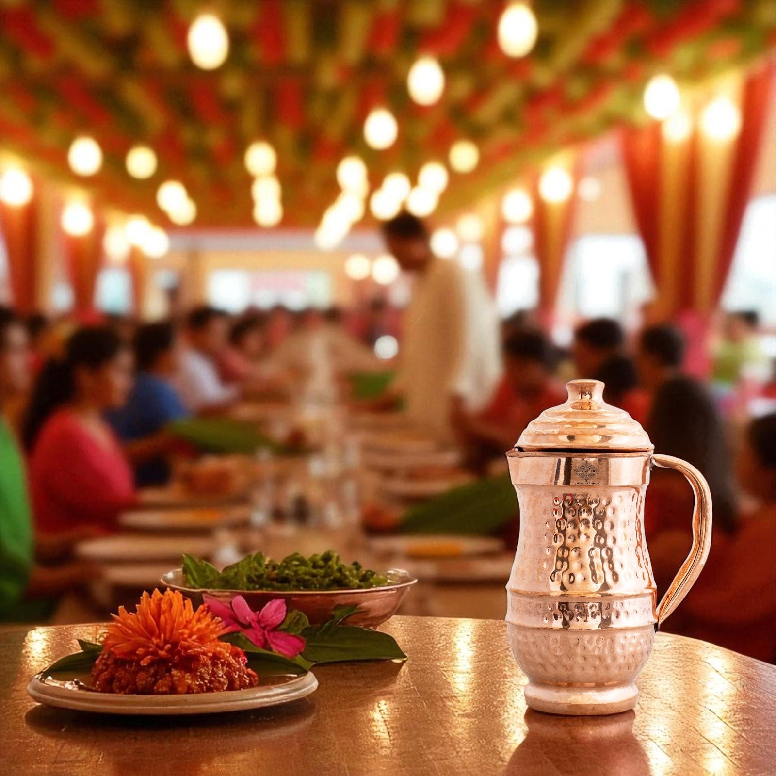 Indian Art Villa Brings Indian Art Villa Pure Copper Hammered Maharaja Style Jug / Pitcher With Lid, which can be used as tableware, Serveware, Drinkware in different volumes. We offer the best affordable prices & Free Shipping PAN India. We also offer Easy returns & exchanges. T&C Applied. Water stored overnight in copper utensils has innumerable health benefits. It has anti-bacterial properties that help purify water & remove toxins. It aids digestion & Weight loss. It protects us from diseases like arthritis, anemia, blood pressure, hyperthyroid, and cancer and relieves us of joint pains. It has immense skin benefits too. Copper is an Antioxidant and anti-carcinogenic that prevents cell damage and slows aging. Copper is the primary element to produce melanin (pigmentation of eyes, hair, and skin) in the human body. One should make it a habit of drinking water stored in copper utensils so as to keep themselves healthy. Storing water in a copper Jug is eco-friendly and hygienic. It maintains the temperature of water Longer than usual.