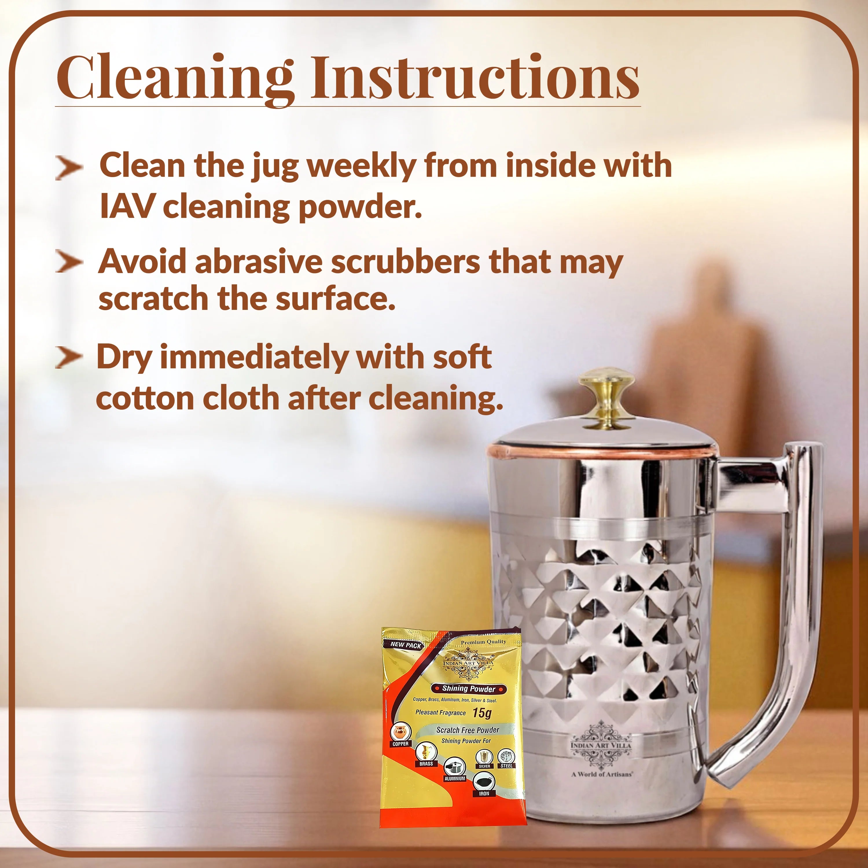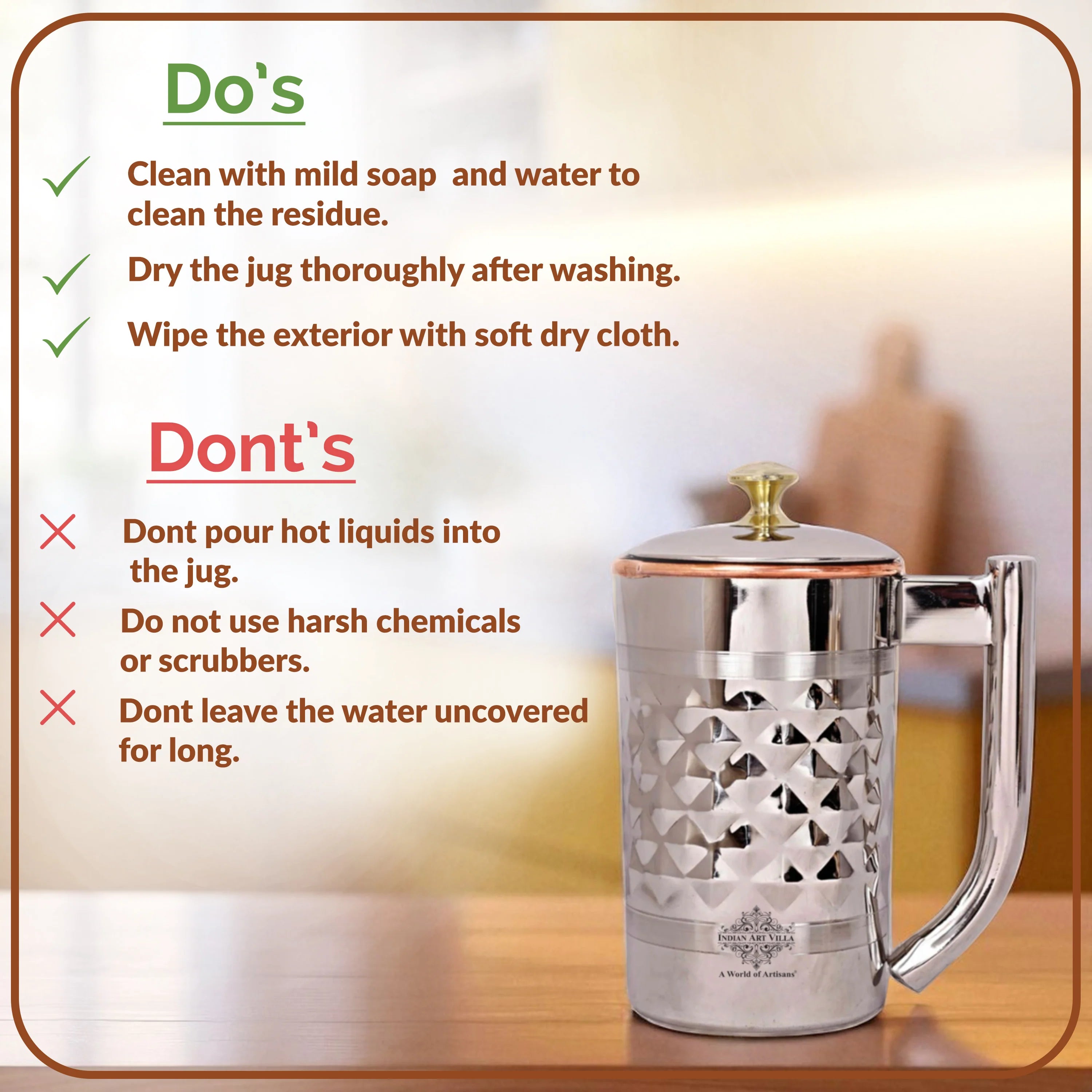 Indian Art Villa Brings Steel Copper Diamond Hammered Design Jug / Pitcher With Designer Handle & a Brass Knob on Lid, which can be used as tableware, Serveware, Drinkware in different volumes. We offer the best affordable prices & Free Shipping PAN India. We also offer Easy returns & exchanges. T&C Applied. Water stored overnight in copper utensils has innumerable health benefits. It has anti-bacterial properties that help purify water & remove toxins. It aids digestion & Mfd. Month/Year : Jan 2022,