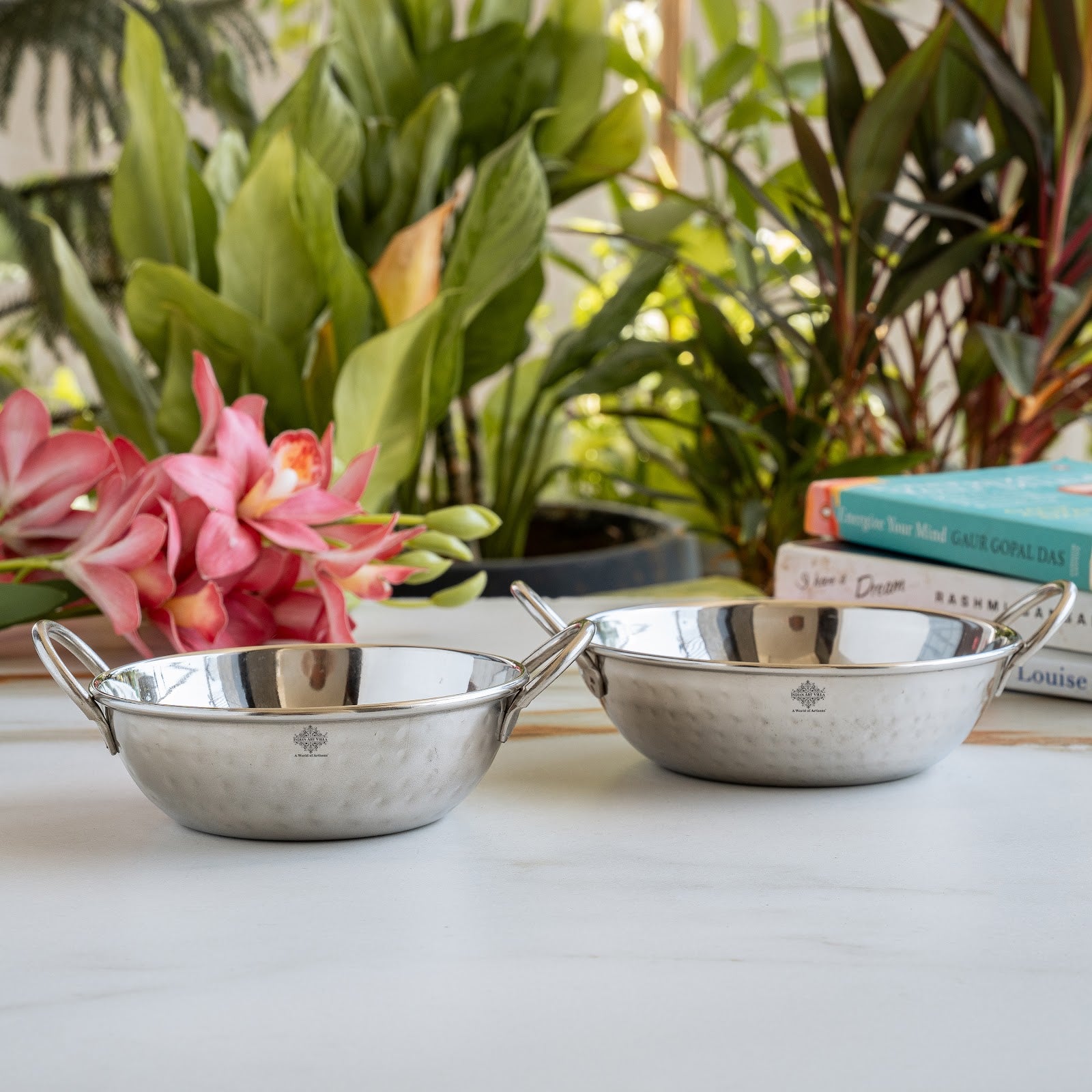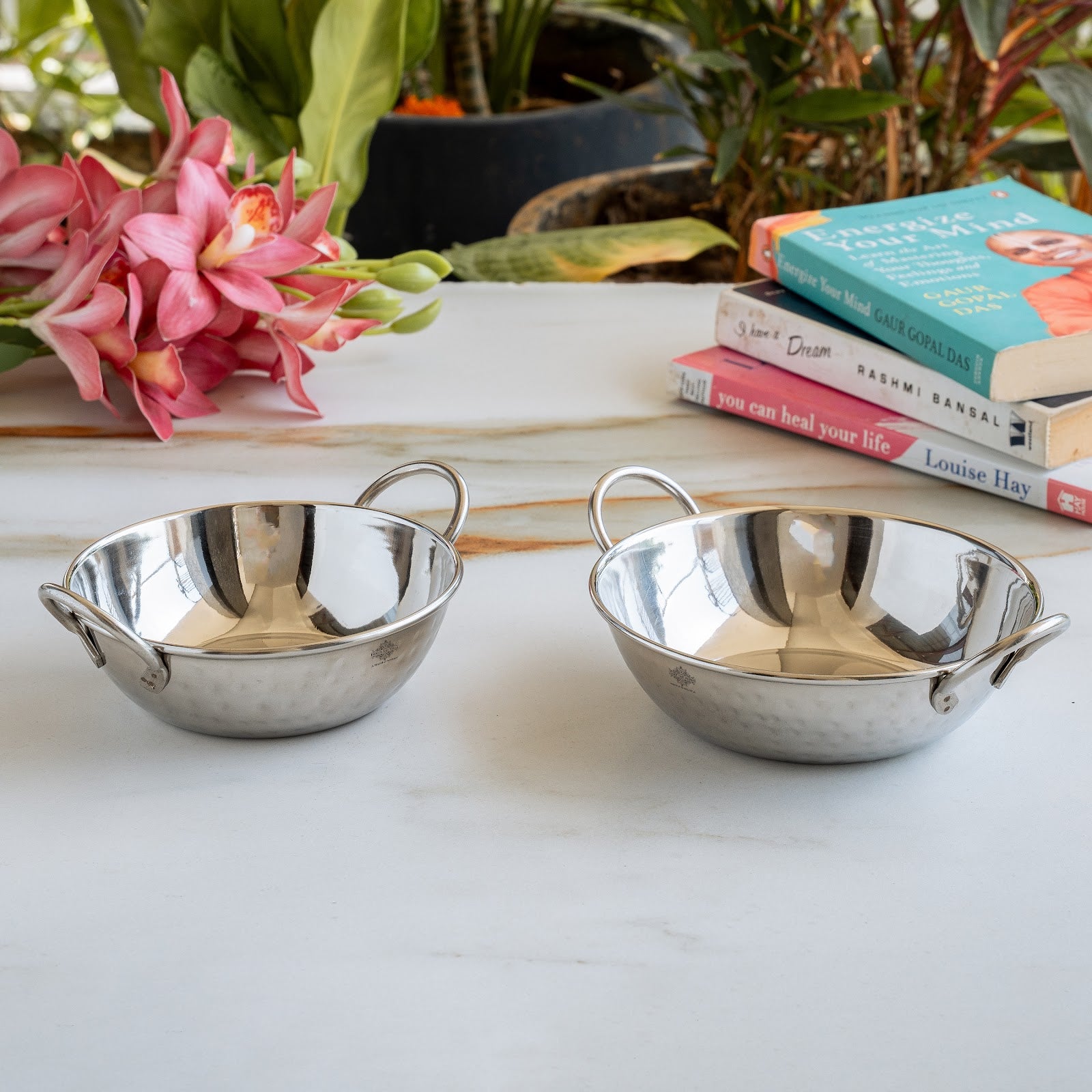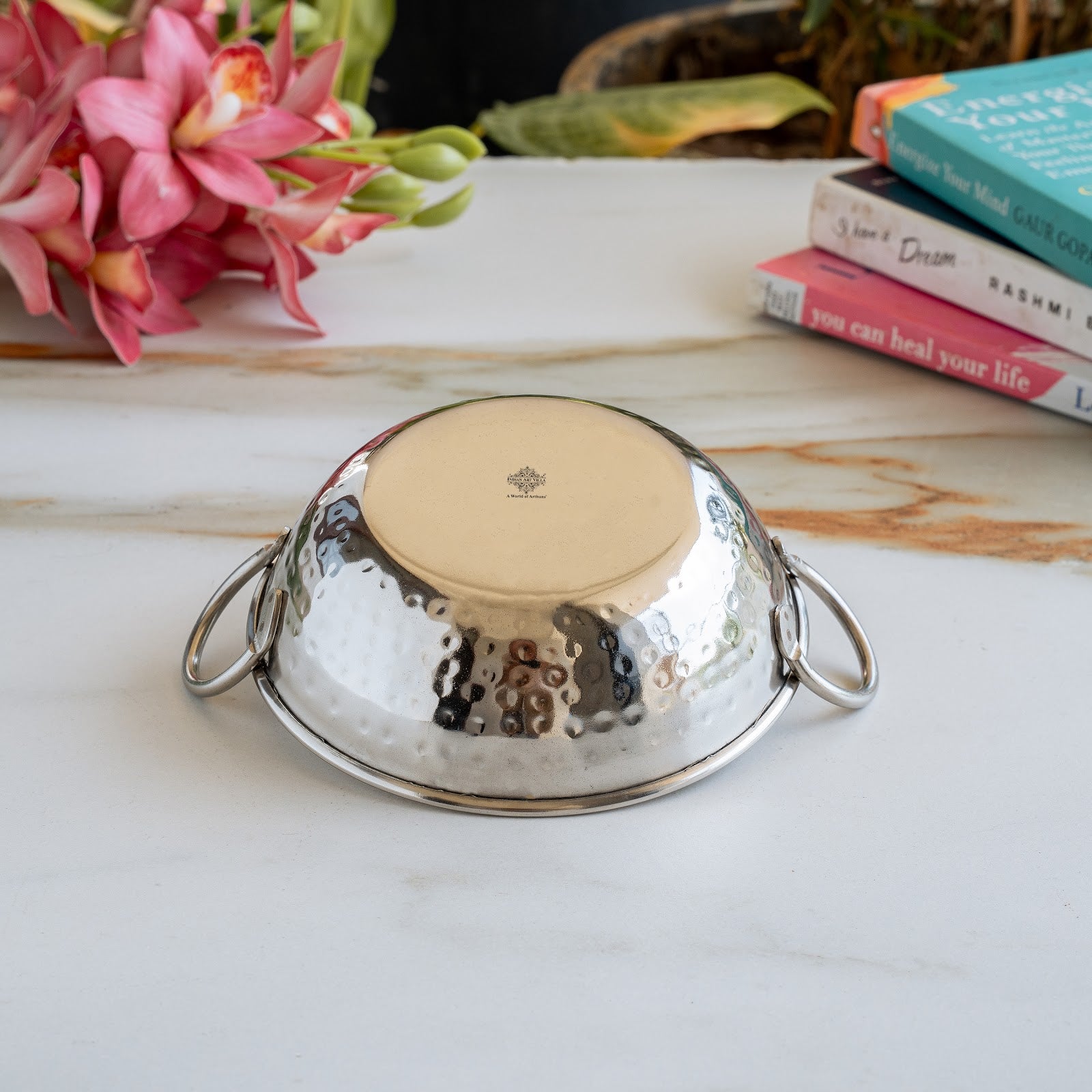 • These Pure Steel Hammer Kadhai with Embossed Handle also have Trendy looks for better ergonomics. You can add Royal Vintage Look to your Kitchen & Dining by using these Set as your Serveware Purpose.