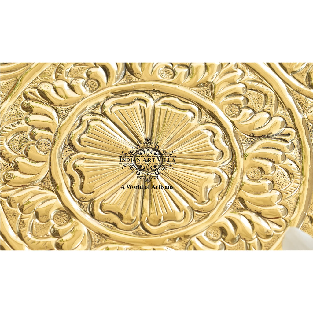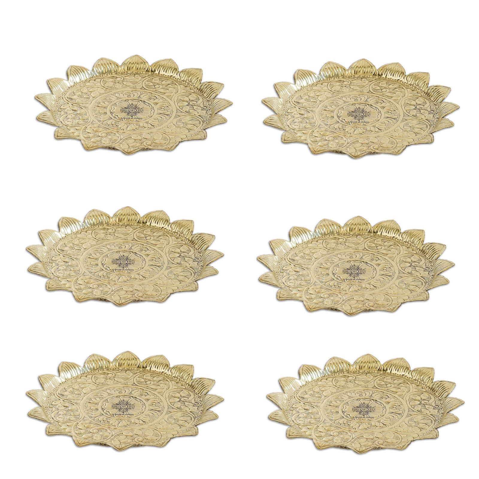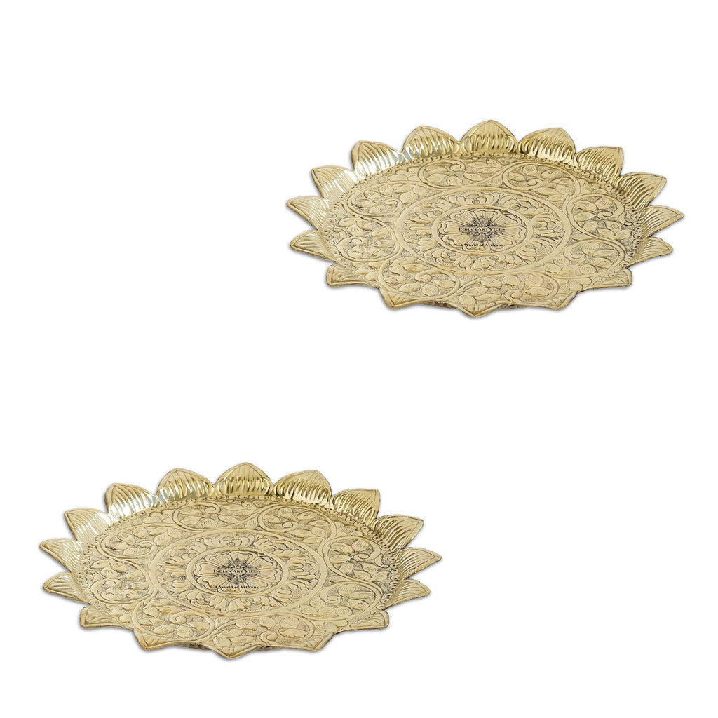 INDIAN ART VILLA Brass Flower Design Sunflower Pooja Thali -13" Dia is a masterpiece of traditional craftsmanship and spiritual elegance. Crafted from premium-quality brass, this exquisite thali serves as a sacred vessel for conducting pooja ceremonies, imbuing the worship space with beauty, grace, and divine blessings. At the heart of its allure lies the intricate sunflower design adorning the surface of the thali. Meticulously crafted with floral motifs and delicate detailing, the design exudes a sense of purity, positivity, and prosperity, symbolizing the divine blessings that accompany the pooja rituals. Each petal of the sunflower intricately represents the rays of the sun, evoking a sense of warmth, illumination, and spiritual enlightenment. With a diameter of 13 inches, the thali provides ample space for arranging various pooja essentials. From diyas to agarbatti, roli-chawal, flowers, and prasad, the flat and sturdy surface of the thali offers a stable base for performing rituals with ease and precision. Whether used for daily prayers, festive celebrations, or special occasions, this thali serves as a versatile accessory that enhances the spiritual ambiance of any pooja room or prayer space. INDIAN ART VILLA Brass Flower Design Sunflower Pooja Thali -13" Dia is more than just a religious accessory; it is a manifestation of divine grace and spiritual reverence, inviting devotees to connect with the divine through rituals of worship and devotion.