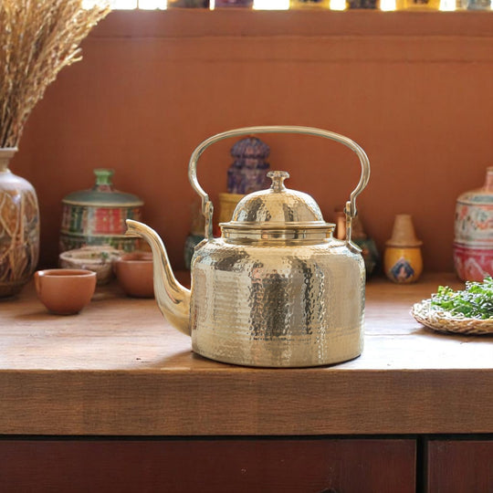 - These Pure Brass Hammered Design Teapot / Kettle with Designer Handle & Inside Tin Lining also have Trendy looks for better ergonomics. You can add Royal Vintage Look to your Kitchen & Dining by using these Set as your Drinkware/Serveware Purpose.