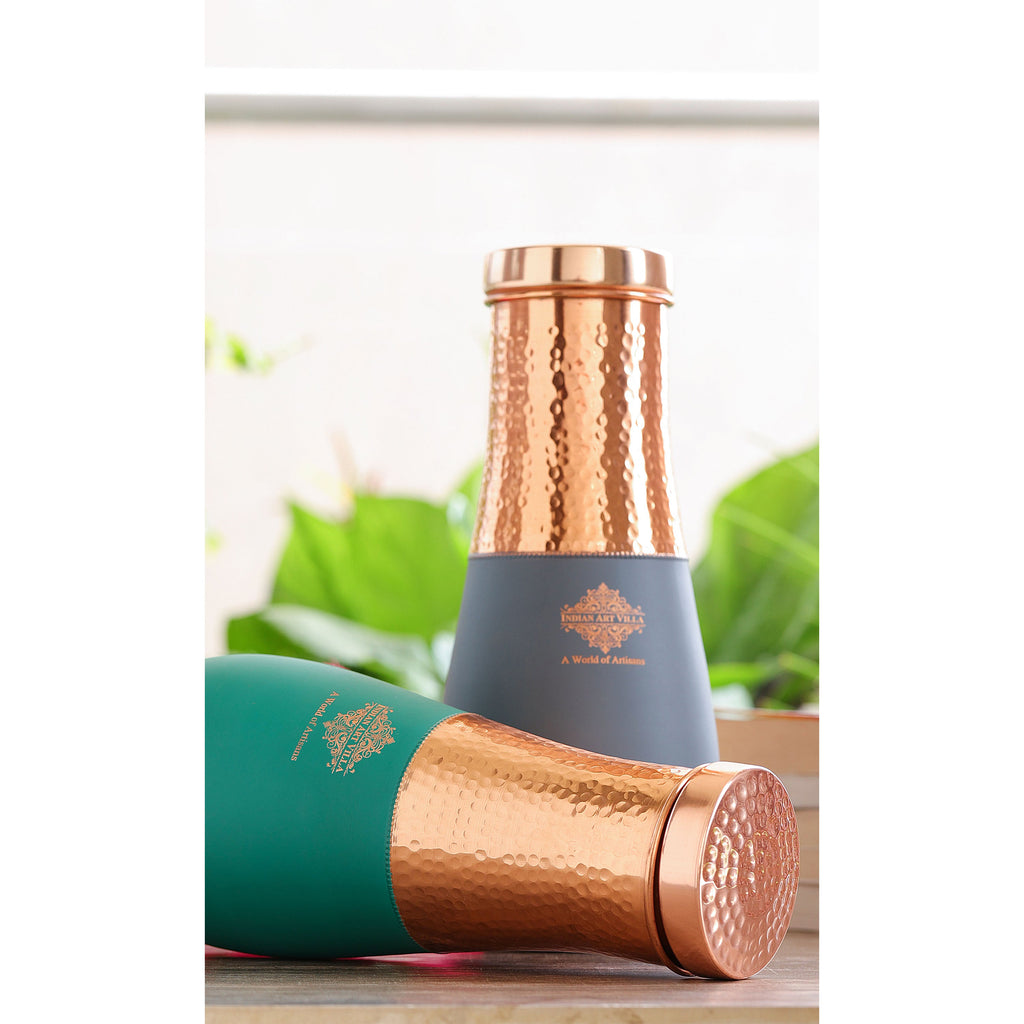 Indian Art Villa Pure Copper Half Hammered and Grey & Green Silk Finish Vase Shape Bedroom Bottle, Volume 48 OZ, Pack Of - 2
