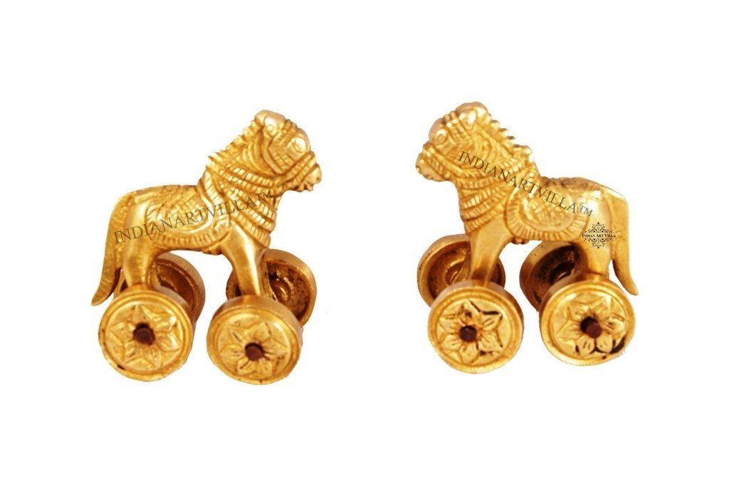 IndianArtVilla 2.5" X 2.0" Set of 2 Handmade Antique Hand Carved Pair of Brass Horse With Wheel Statue Figurine Showpiece Gift Item
