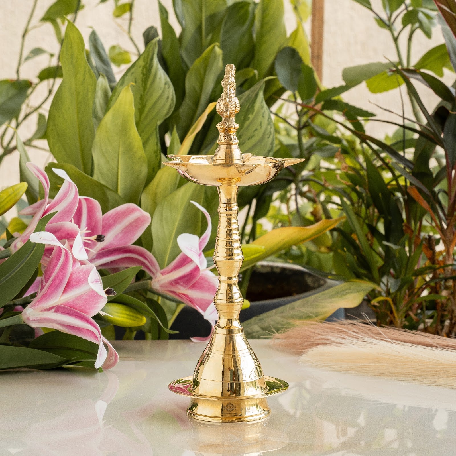 Indian Art Villa Presents Best Quality Brass Handmade Stand/Pillar Diya/Deepak/Lamp/Lantern With Kerala+Murga Design. We offer the best affordable prices & Free Shipping PAN India. We also offer Easy returns & exchanges. T&C Applied. Brass Oil lamps are commonly used in Hindu temples as well as in-home shrines. Generally, the lamps used in temples are circular with places for five wicks. Oil lamps are safe to use indoors to light up the room and provide brightness at night. Standing Deepak is hand made and looks very elegant to light-in up your festival and home. Brass divas are used as permanent fixtures in homes and temples. Brass oil lamps are handsome to look at and Nov. be used as a decor item for the living room . Diyas are used for offering fire at the altar of Hindu god. A Diya or Jyoti is a symbol of knowledge, purity, good luck, prosperity. In other words, it represents the absence of darkness/ignorance.