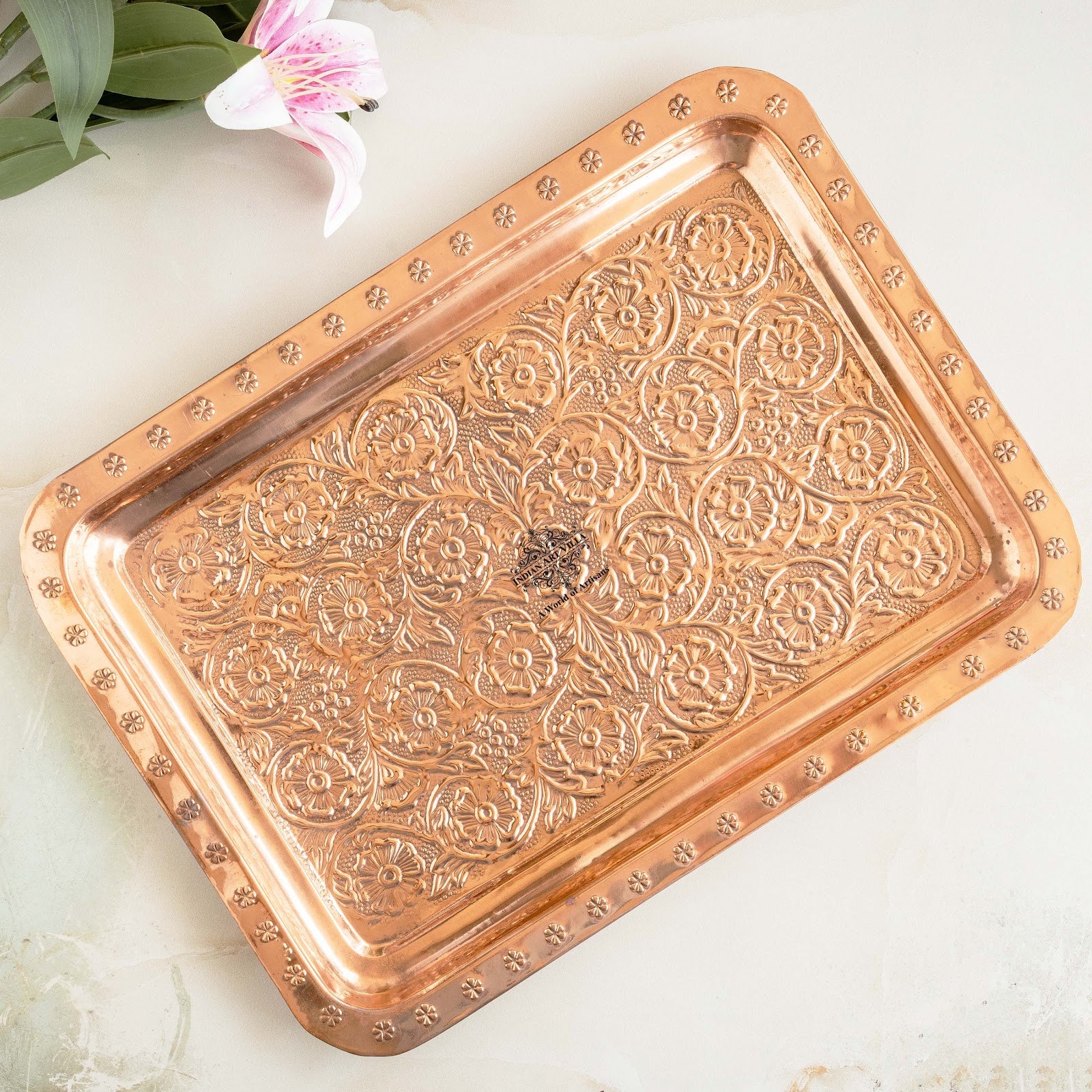 Indian Art Villa Handcrafted Pure Copper Engraved Flower Design Tray