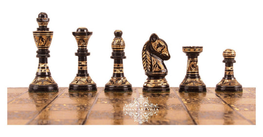 Indian Art Villa Collectible Brass Chess Set in Coffee Brown and Golden is a masterpiece of craftsmanship and elegance. Crafted with meticulous attention to detail, this chess set combines traditional aesthetics with modern sensibilities to create a truly captivating piece. The set includes 32 chess pieces, divided evenly between coffee brown and golden hues, adding a touch of sophistication and luxury to the game. Each piece is intricately designed and carefully crafted from high-quality brass, ensuring durability and longevity. The chessboard itself is a work of art, featuring a smooth surface and fine detailing around the edges. The alternating squares in coffee brown and golden colors create a visually stunning contrast that enhances the overall aesthetic appeal of the set.