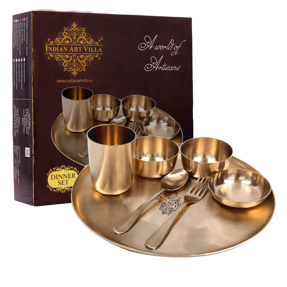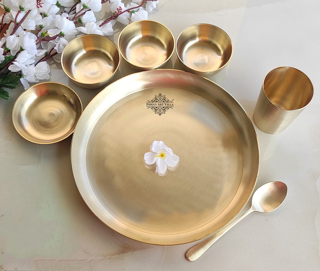 Indian Art Villa Presents Top Quality Brass Matt Finish Thali or Dinner Set, Dinner Set that includes 1 Thali / Plate, 3 Vegetable Bowls, 1 Dessert Bowl, 1 Spoon, & 1 Glass / Tumbler. We offer best affordable prices & Free Shipping PAN India. We also offer Easy returns & exchanges. T&C Applied. Cooking is an art and plating it in the right way is just accentuating the art with all that detailing! When talking about dinner set, it is something which has the power to make or break the beauty of dining table. It has the power to make or break the beauty of dining table. Having meals in Brass Dinner set / Dinnerware gives a royal touch as well as improves your overall health. Mainly, it pacifies Vata (dry skin, nervous temperament, irritability) and pitta. It also helps reduce obesity, improve eyesight, and skin condition.. Brass is a material that has been used and cherished by our ancestors and it possess some miraculous health benefits which have been proved scientifically as well. there wasn’t even a single home without Brass Kitchenware. This ancient metal is rarely used these days, however, it offers tremendous benefits.