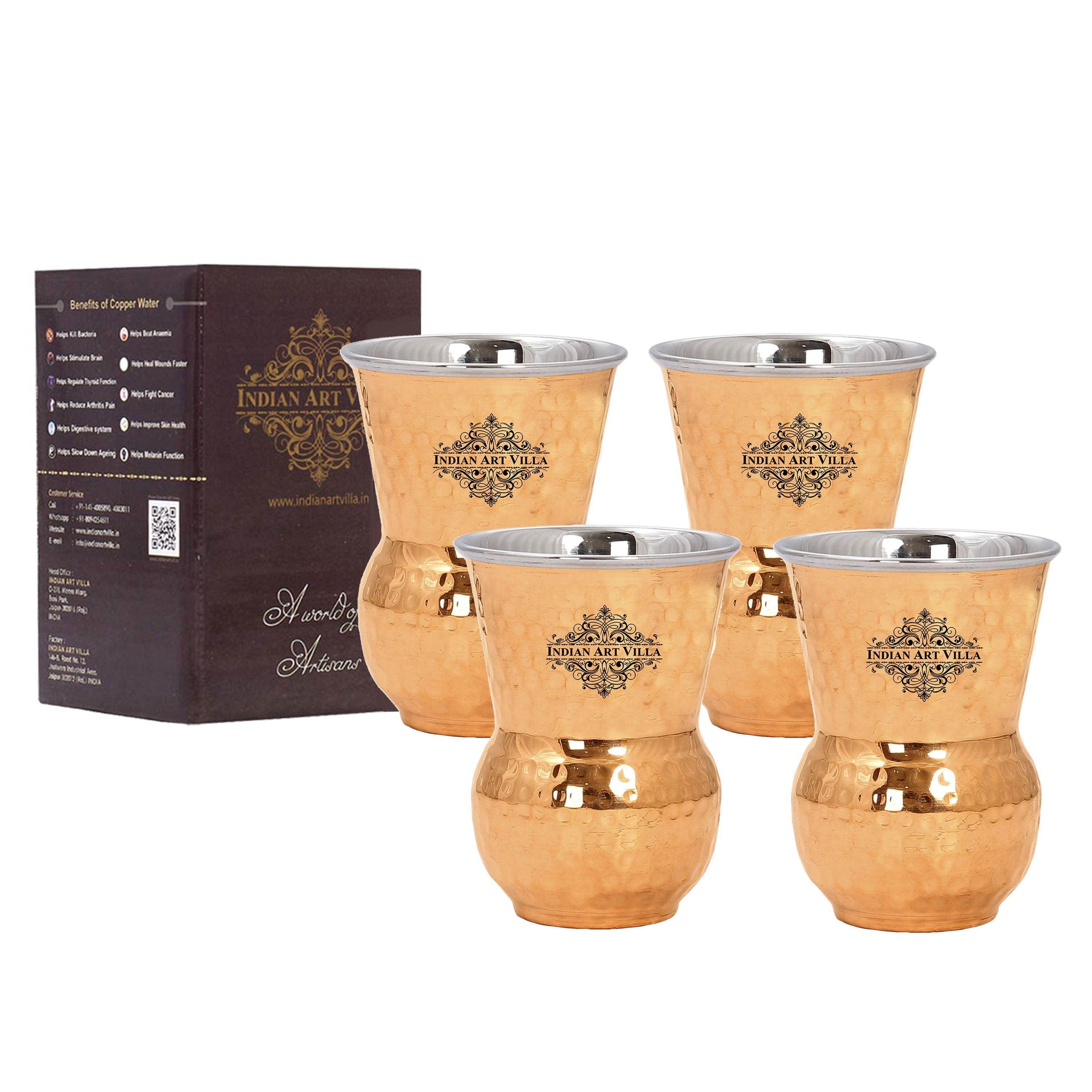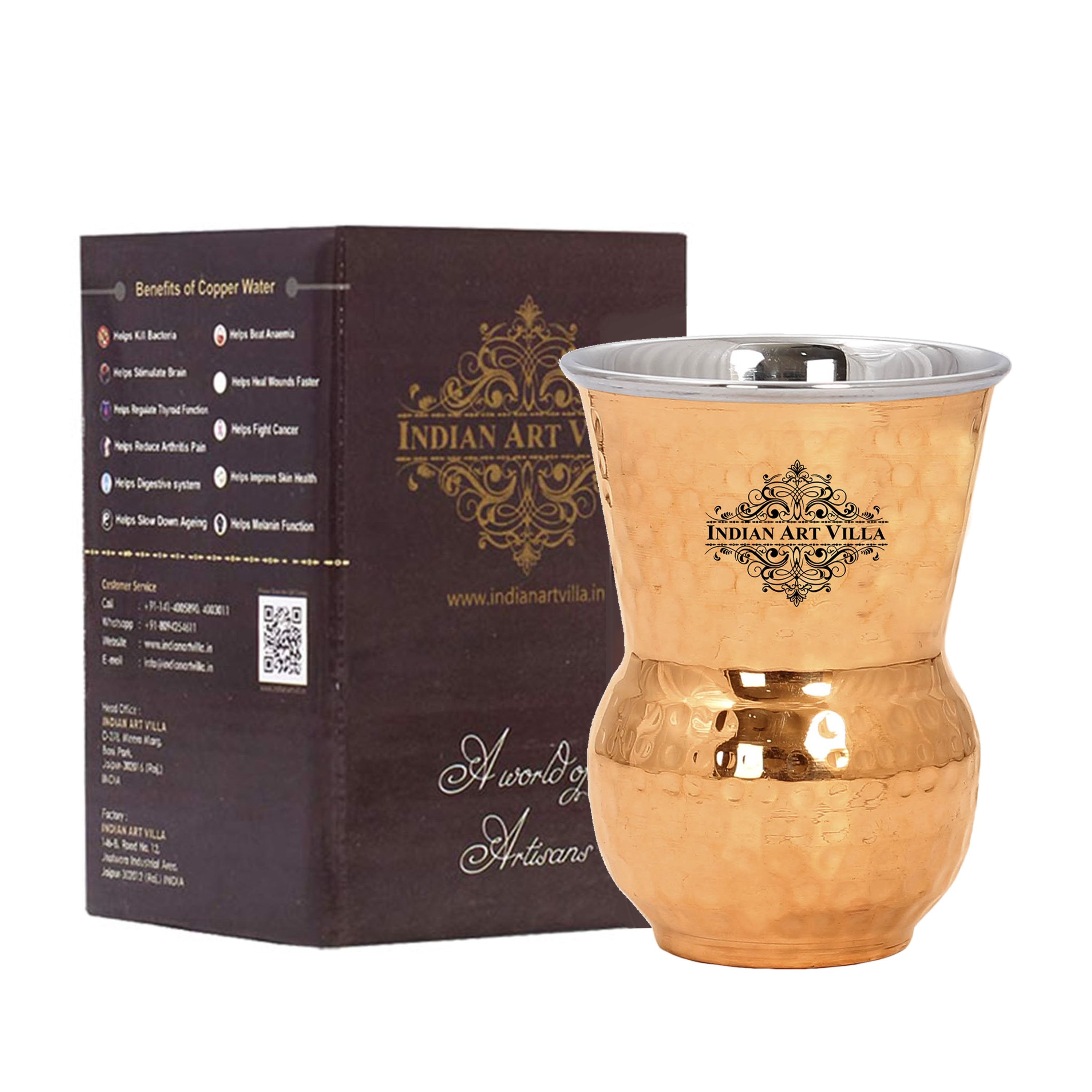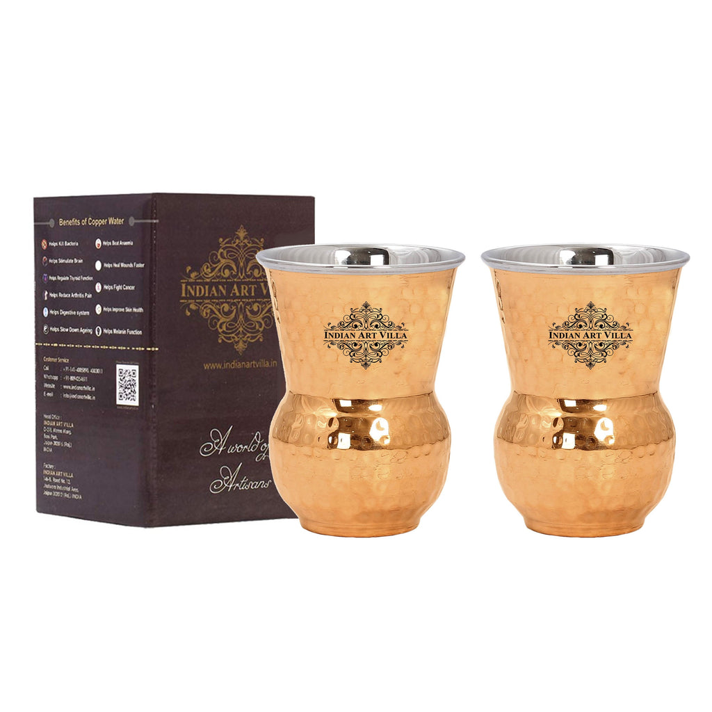 Indian Art Villa Presents Best Quality Steel Copper Hammered Pilsner, Mathat, Cocktail, Manhattan Glass, Tumbler that are used as Drinkware, Serveware, Barware with a capacity of 400 ml & 700ml. We offer best affordable prices. Drinking the Water stored in copper utensil has innumerable health benefits. It has anti bacterial properties that helps purify water & remove toxins. It aids digestion & Weight loss. It protects us from diseases like arthritis, anaemia, blood pressure, hyper thyroid, cancer and relieves us of joint pains. It has immense skin benefits too. Copper is an Antioxidant and anti-carcinogenic that prevents cell damage and slows aging. Copper is primary element to produce melanin (pigmentation of eyes, hair and skin) in human body. The easiest and the cheapest way to cure the copper deficiency is to drink the water stored in copper vessels. One should make it a habit of drinking water stored in copper utensils so as to keep themselves healthy. We suggest that one should drink this water stored in copper vessel in copper Tumblers / Glasses only so that the pH level of water doesn't changes when filled from copper vessel into glasses and it stays as healthy as it was for you earlier.