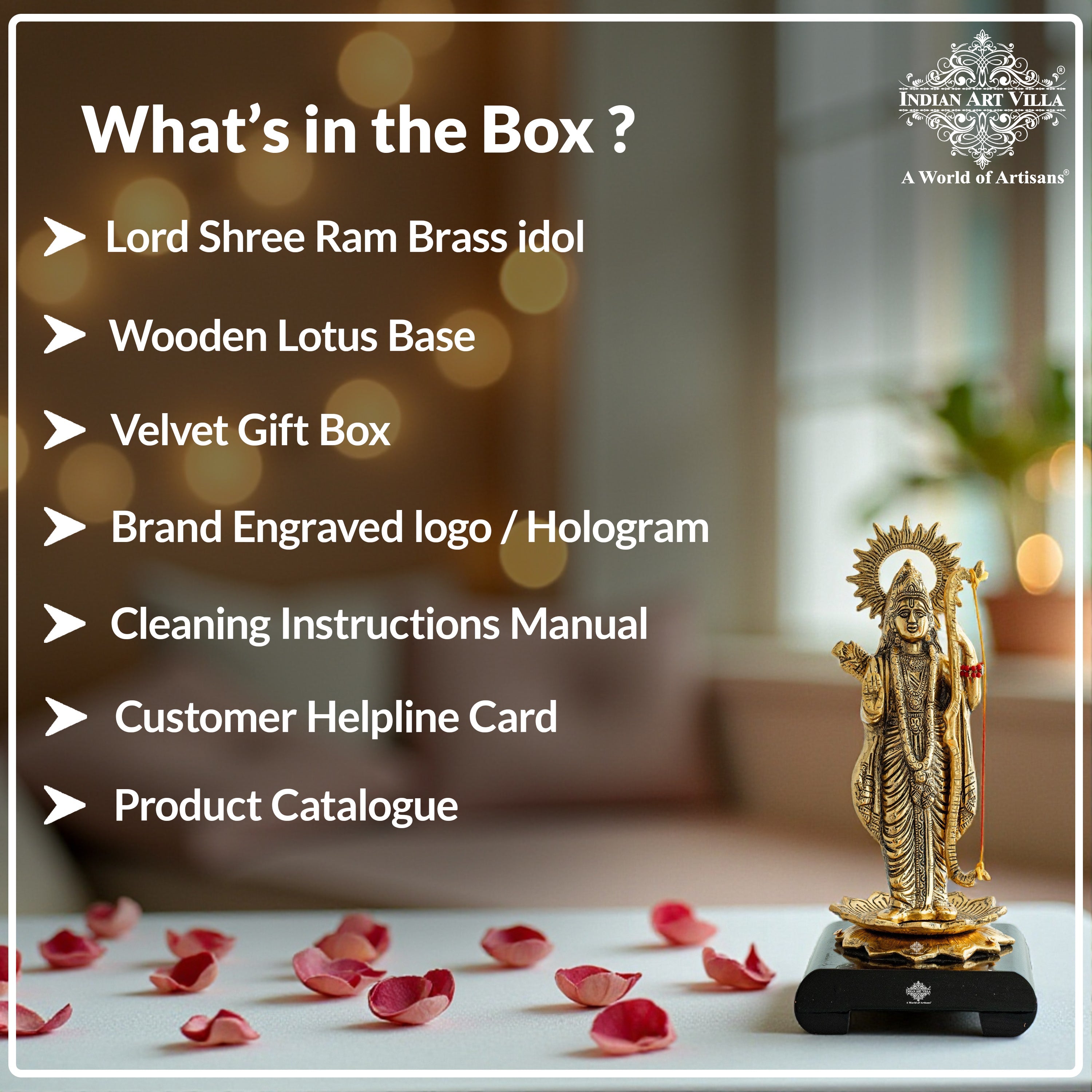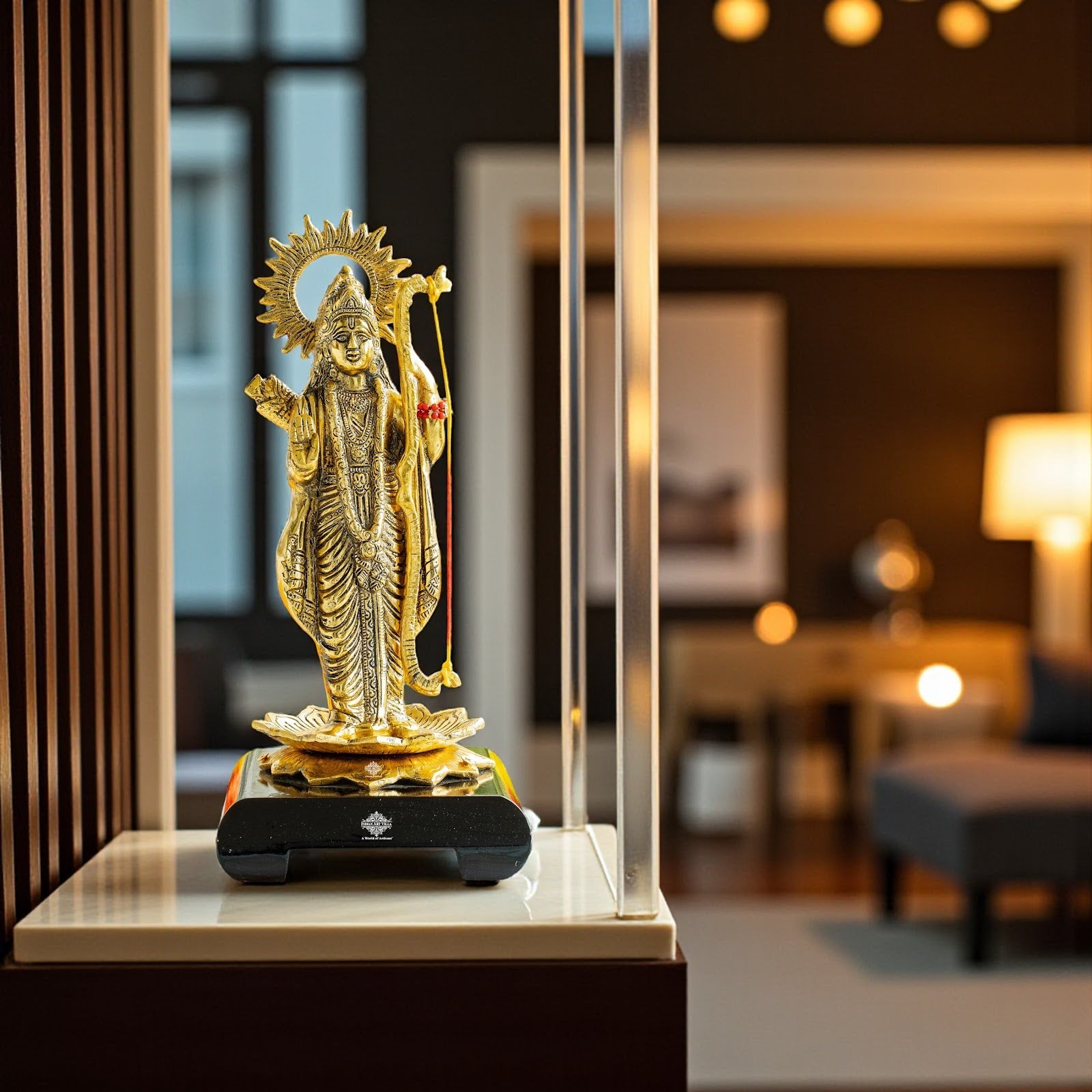 Mounted on a sturdy black pedestal embossed with the Indian Art Villa emblem, this idol is not only a symbol of spirituality but also a piece of fine craftsmanship. Whether placed in a pooja room, temple, living area, or gifted to loved ones, it radiates positivity, harmony, and blessings.