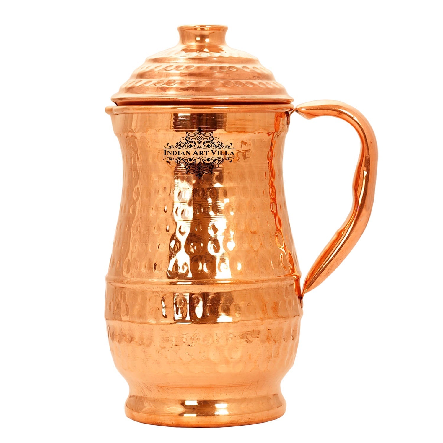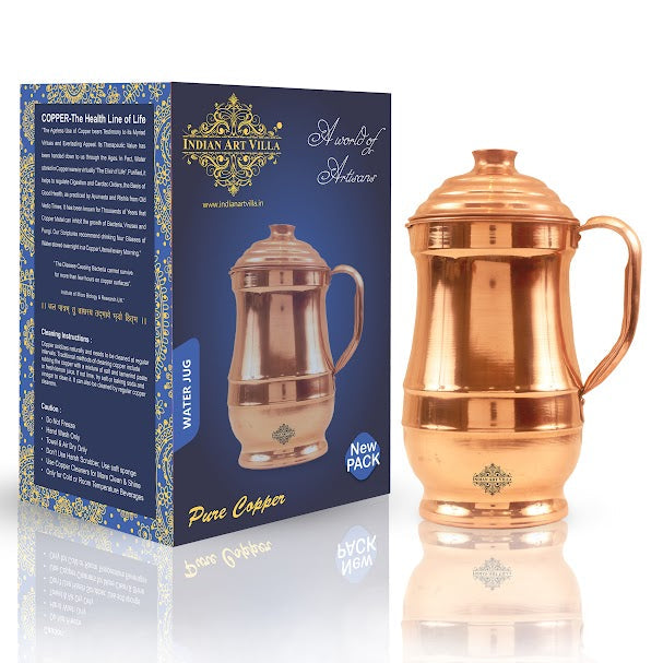 Indian Art Villa Brings Indian Art Villa Pure Copper Hammered Maharaja Style Jug / Pitcher With Lid, which can be used as tableware, Serveware, Drinkware in different volumes. We offer the best affordable prices & Free Shipping PAN India. We also offer Easy returns & exchanges. T&C Applied. Water stored overnight in copper utensils has innumerable health benefits. It has anti-bacterial properties that help purify water & remove toxins. It aids digestion & Weight loss. It protects us from diseases like arthritis, anemia, blood pressure, hyperthyroid, and cancer and relieves us of joint pains. It has immense skin benefits too. Copper is an Antioxidant and anti-carcinogenic that prevents cell damage and slows aging. Copper is the primary element to produce melanin (pigmentation of eyes, hair, and skin) in the human body. One should make it a habit of drinking water stored in copper utensils so as to keep themselves healthy. Storing water in a copper Jug is eco-friendly and hygienic. It maintains the temperature of water Longer than usual.