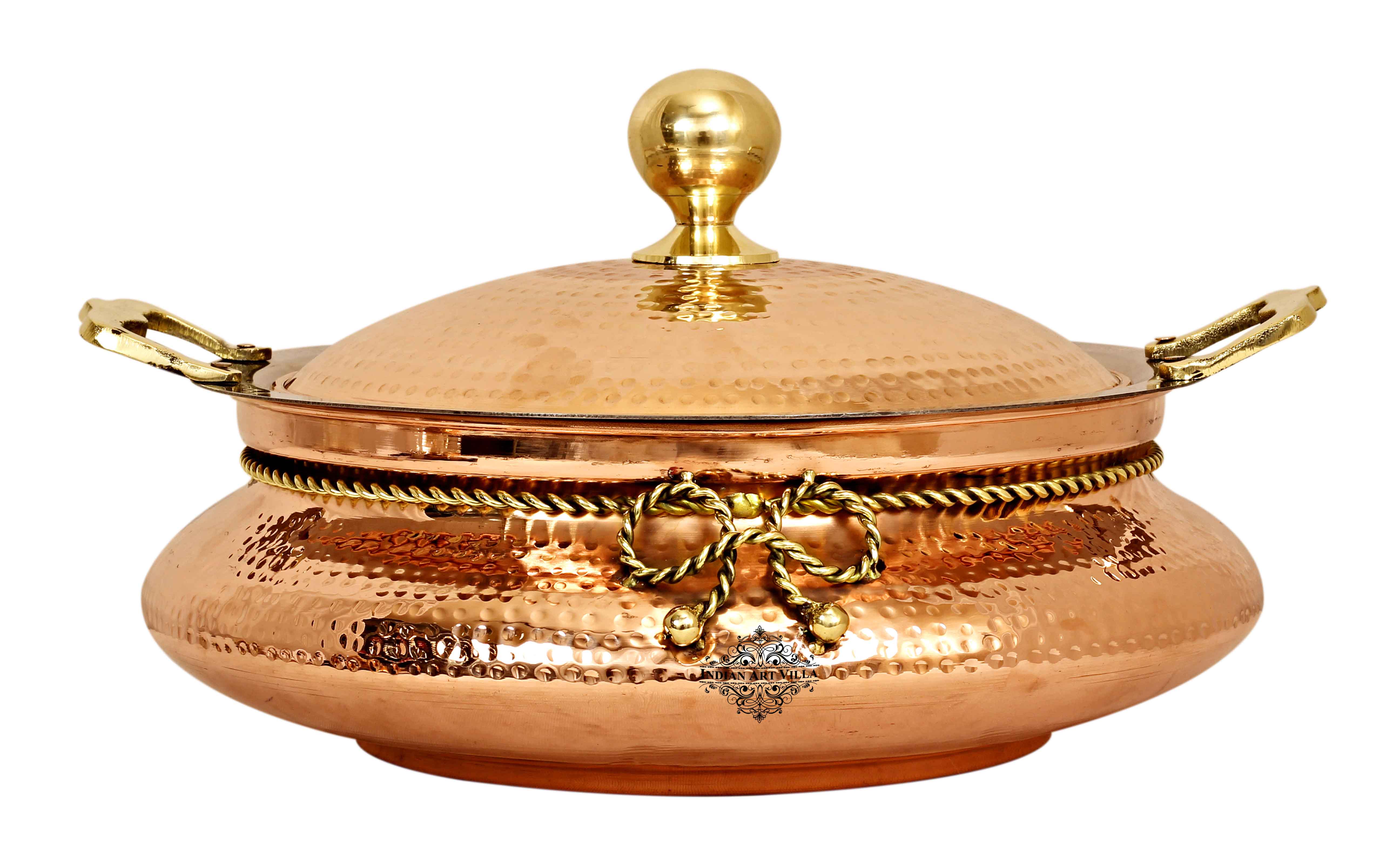 Indian Art Villa Presents Best Quality Pure Steel Copper Hammered Chafing Dish. We offer the best affordable. This Beautiful Pure Steel Copper Hammered Chafing Dish can be used as a home decor item or it can also be gifted to your near and dear ones. Also, Make your home more lively and cheerful with this brilliant decor piece. Designed to accentuate the beauty and ambiance it brings soothing vibes to your abode and raises its contemporary look manifolds. It is sheer elegance and contemporary in look. Relish Indian cuisine in Indian style! This is a set of centerpiece serve-ware for Indian food. Serve Indian dishes to your friends and family in this unique and ethnic-looking centerpiece serve ware. With this serving utensil set your Indian style dining experience goes several notches up. The material used is food grade. Hammered Copper is used only on the outside of the utensil and does not come in contact with the food. Only high-quality food-grade stainless steel is in contact with the food. Two layers of metal with an air cushion ensure that the food stays warm much longer. Serving dinner in this dinnerware Chafing Dish would be an unforgettable experience. Indian Art Villa Copper items have antique designs. The item is highly durable, elegant, and a wonderful addition to your Home Decor.
