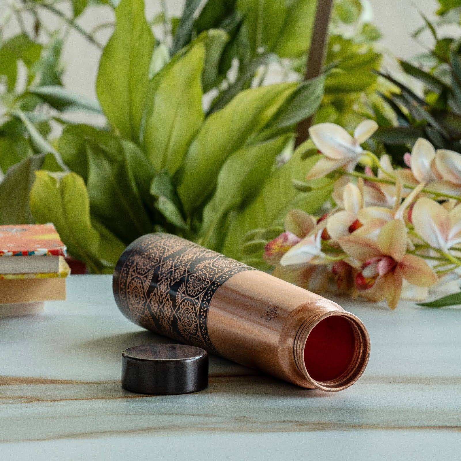 Pure Copper Water Bottle with Antique Dark Embossed Deisgn - 800 ML