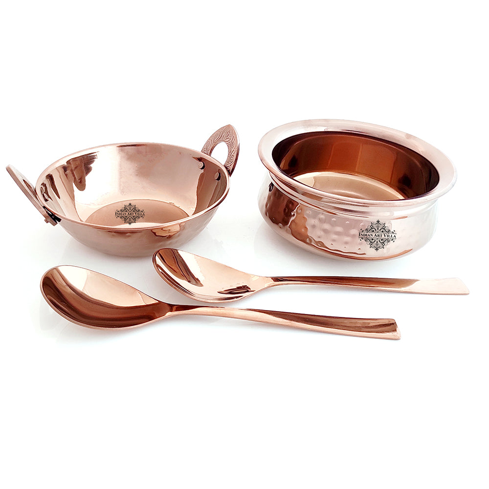 The Indian Art Villa Brings Hammered D/W Gold Rose Finish Stainless Steel Kadhai, Handi with 2 Serving Spoons. We also offer Easy return & Exchanges, T&C Applied. A beautifully crafted collection of kitchen essentials that combines functionality and style. This set includes a handi (pot), a kadhai (wok) and two serving spoons, all finished in a stunning rose gold hue. The handi and kadhai feature a hammered design that not only adds visual interest but also enhances the durability and heat distribution of the cookware. The set is made from high-quality steel, ensuring long-lasting performance and easy maintenance. Whether you're preparing a delicious home-cooked meal or hosting a gathering, this Indian Art Villa Hammered D/W Gold Rose Finish Stainless Steel Steel Set will elevate your culinary experience. Invest in this exceptional kitchen collection and enjoy the perfect blend of form and function.
