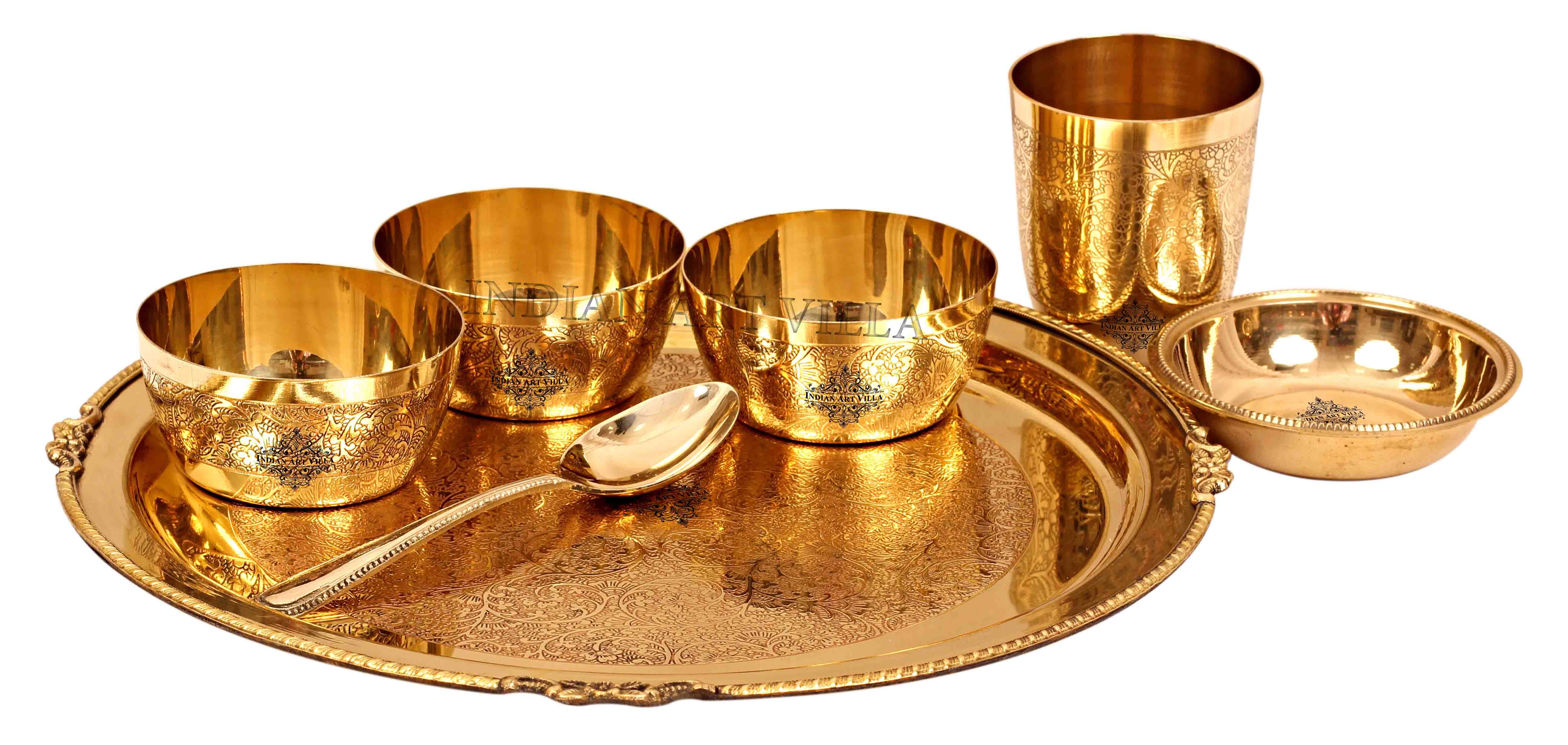 - Brass-Embossed Design Construction: Each piece in this thali dinner set features a captivating embossed pattern, crafted from high-quality brass, this dinner set boasts durability, resilience, and a timeless appeal.