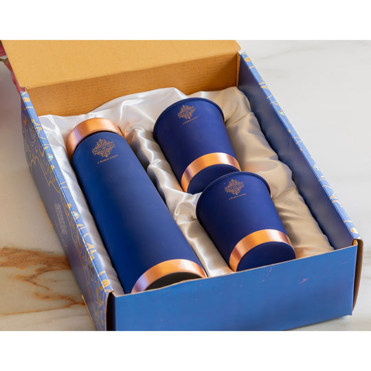 Indian Art VIlla Pure copper bottle with 2 Copper Glass Navy Blue copper, A Beautiful Path to Wellness , Vol. Bottle-32 oz, Glass-12 oz
