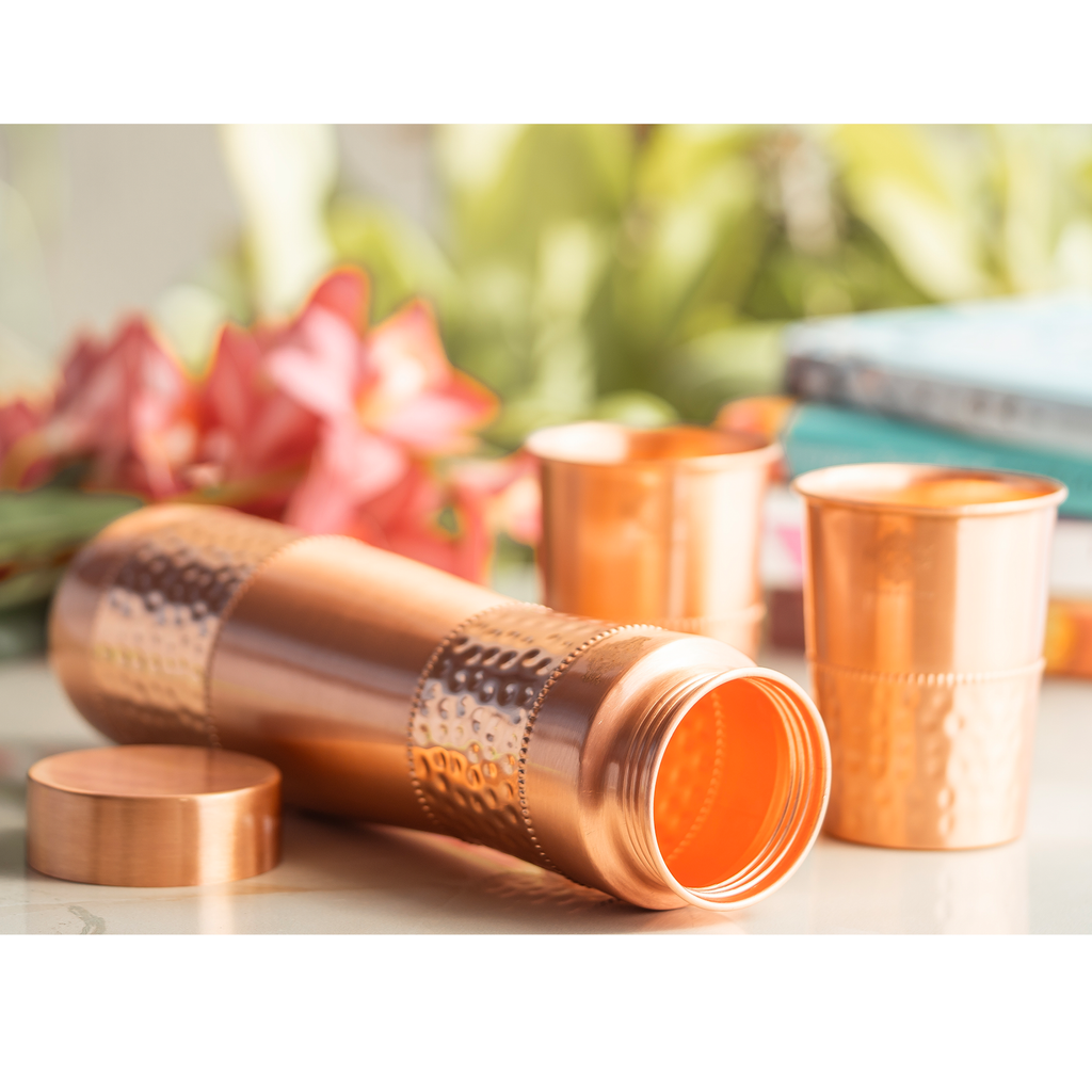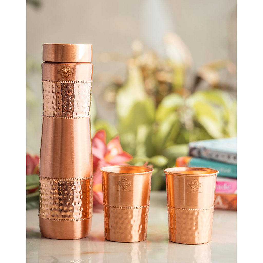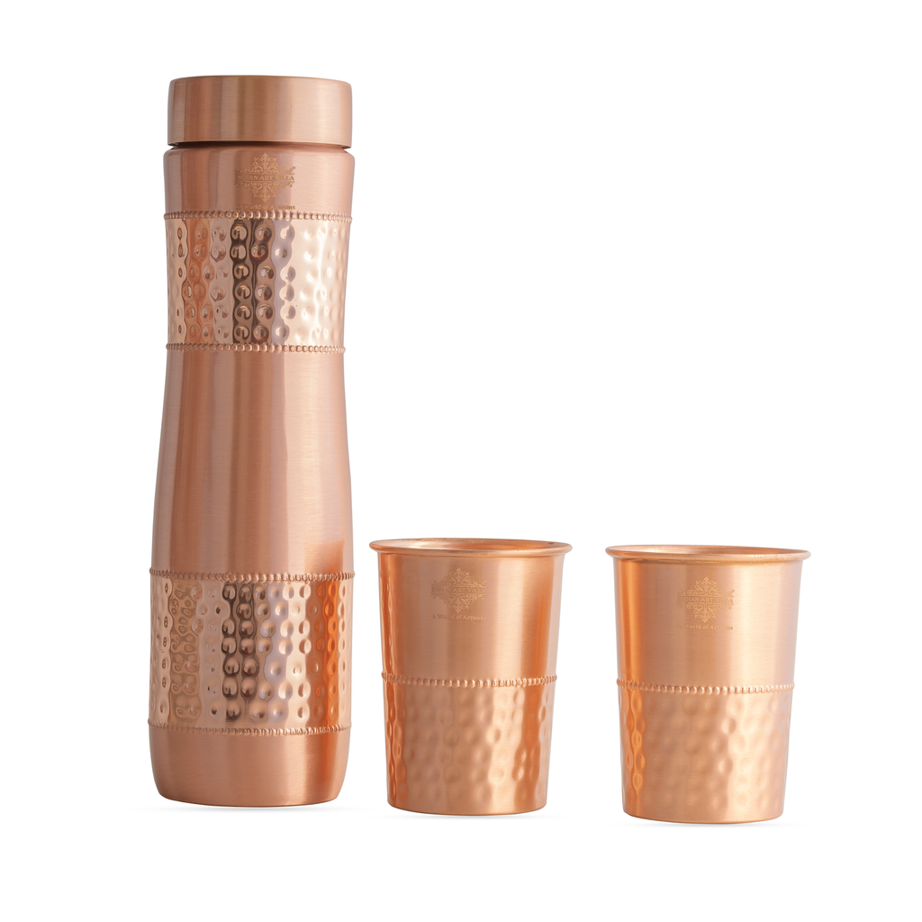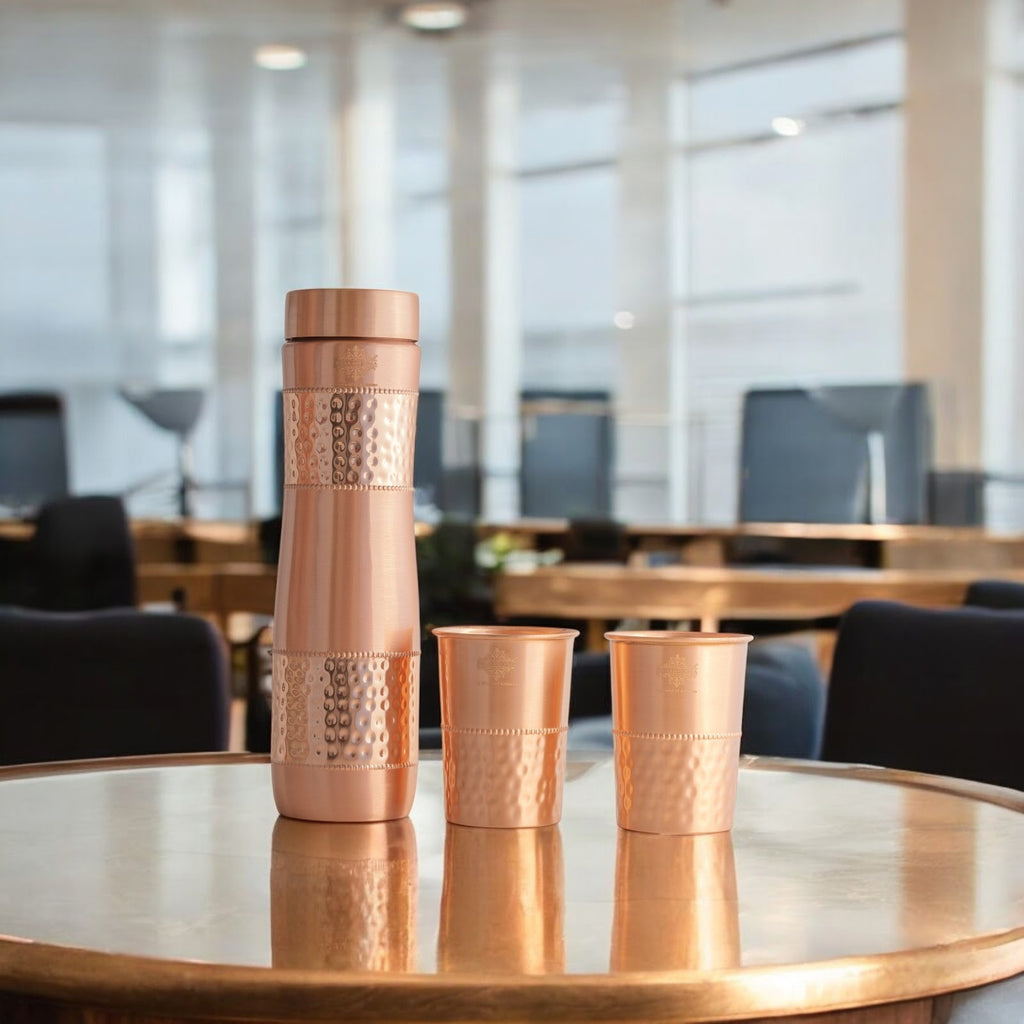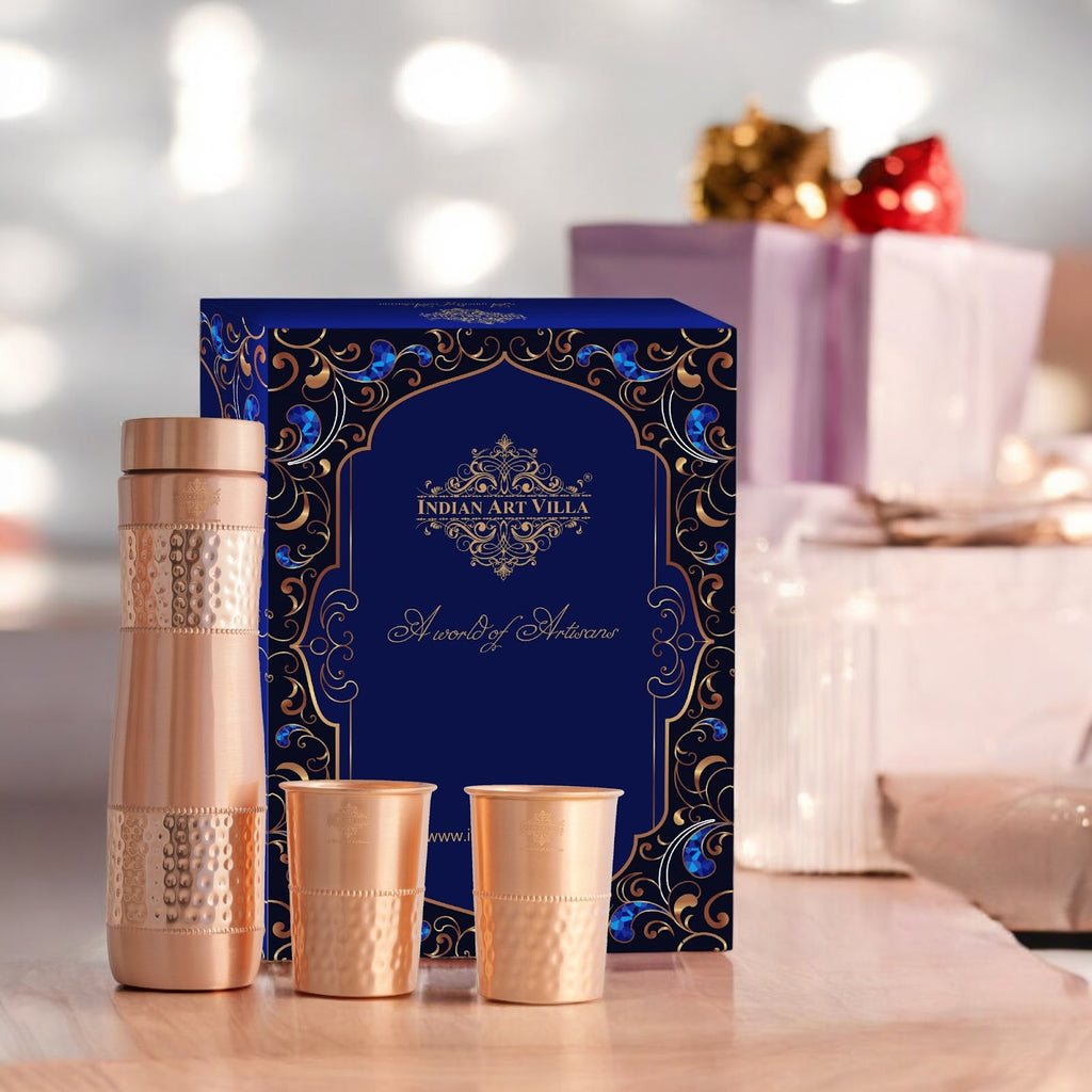 Premium Copper Gift Set: This luxurious drinkware set includes 1 bottle (1000 ml) and 2 glasses (275 ml each), all crafted from pure copper with a stunning half lacquer and half hammered finish, combining traditional elegance with modern design