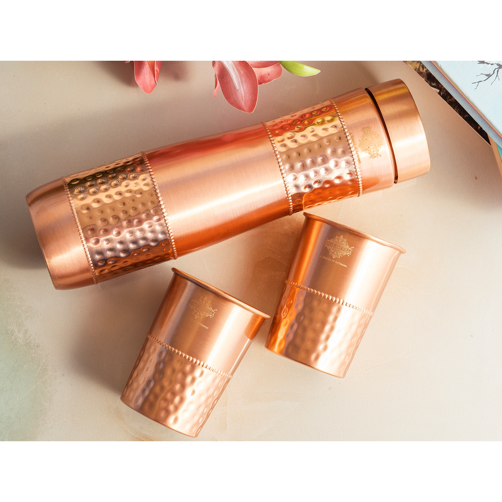 Indian Art Villa Copper Drinkware Gift Set of 2 Glass and 1 Bottle With Half Lacquer Half Hammer Design