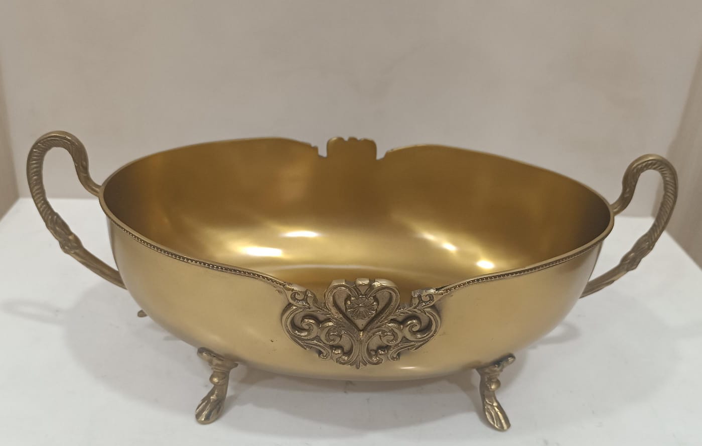 This stunning bowl features a rich golden hue, enhanced with ornate embossed patterns and sculpted decorative side handles that make it a centerpiece of attention. The bowl rests gracefully on carved pedestal-style legs, giving it elevation and a majestic presence on any surface.