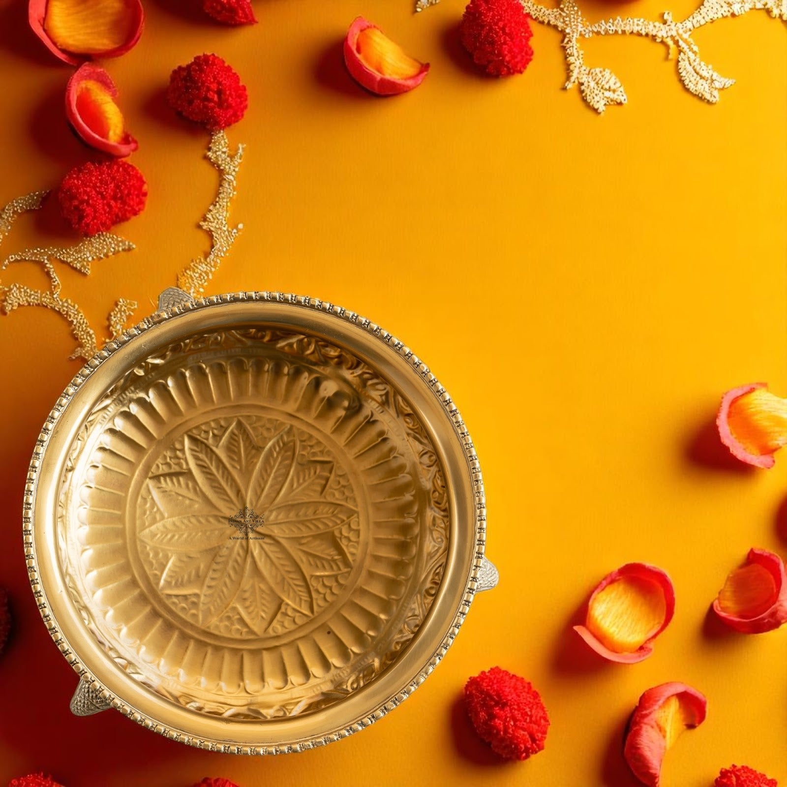 Made from pure brass, this urli showcases exquisite hand-embossed floral and vine patterns across its round bowl. Its standout feature lies in the three elephant trunk-shaped legs, each sculpted with intricate detailing that symbolizes strength, wisdom, and prosperity in Indian culture. This majestic design not only adds visual appeal but also provides a stable and elevated base to enhance its presence wherever placed.