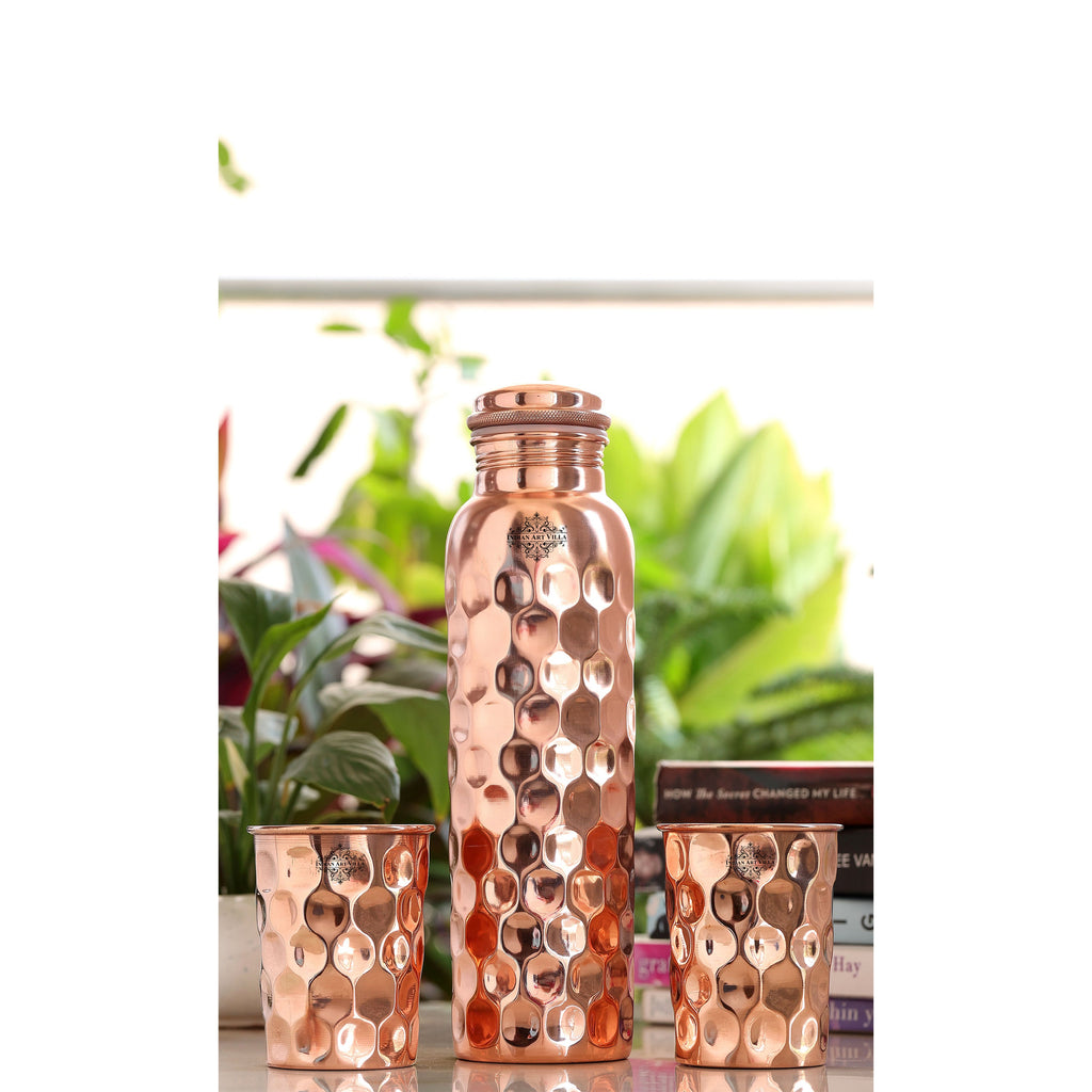 Indian Art Villa Pure Copper Drinkware Gift Set of Diamond Hammered Design 1 Bottle & 2 Glass With Royal Blue Gift Box, Bithday & Parties, Bottle & Glass