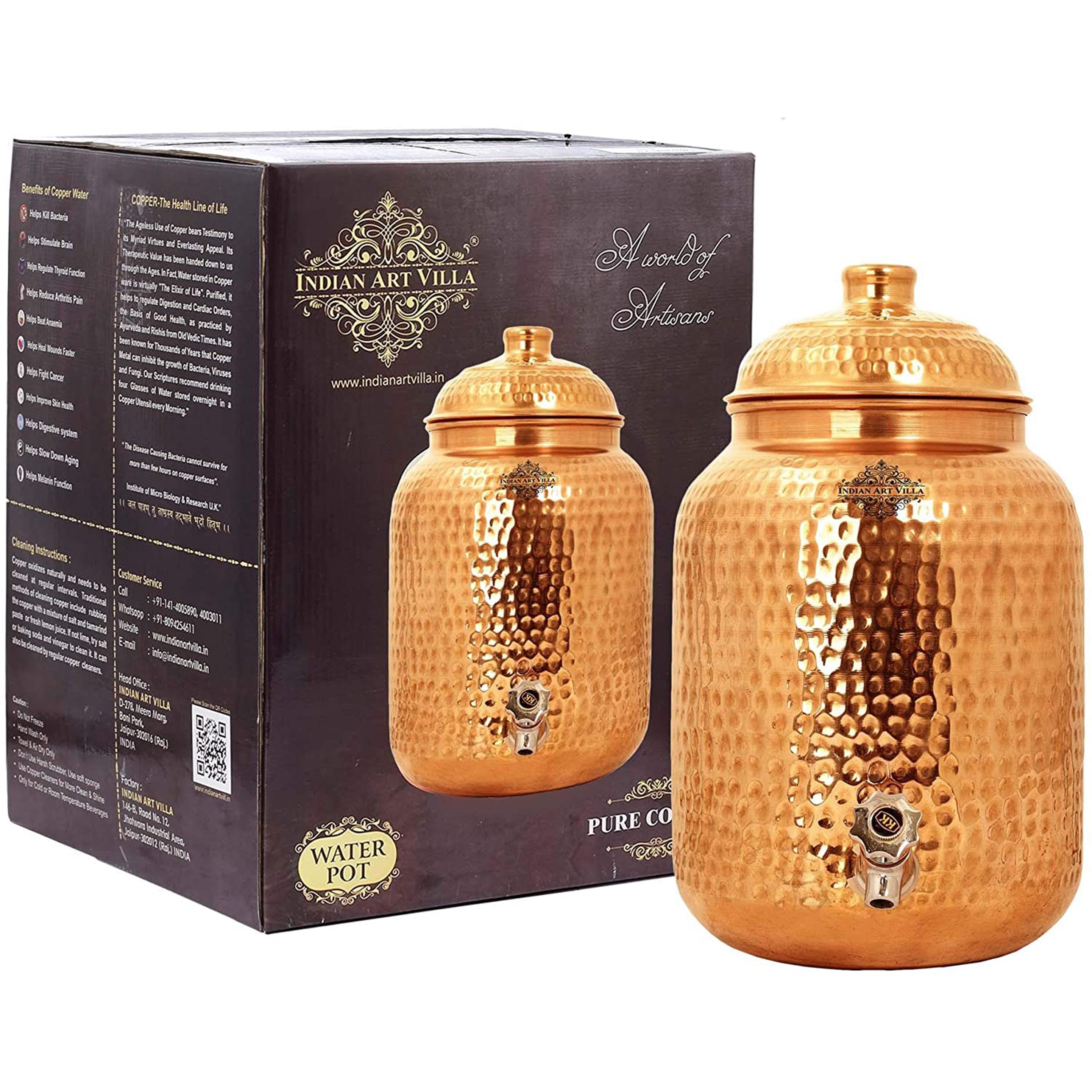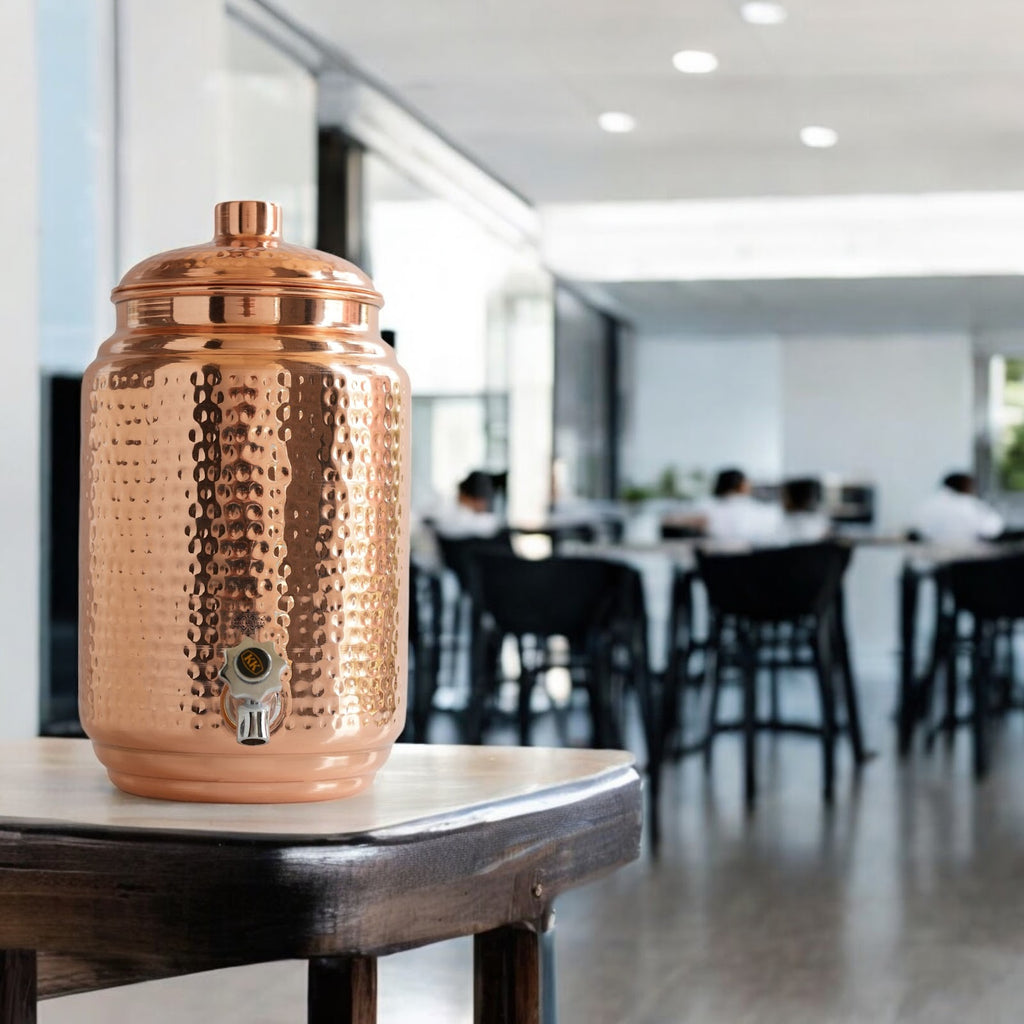 Elevate your hydration experience with the Indian Art Villa Pure Copper Hammered Design Water Pot. Crafted from pure copper, this elegant and durable water pot is designed to combine traditional craftsmanship with modern usability. Its seamless, joint-free construction ensures leak-proof performance and a long-lasting build, making it the perfect companion for home, office, and special occasions. With a generous capacity of 2 liters, 5 liters, 10 liters this pot is ideal for storing and serving water for families, gatherings, or workplaces. The intricate hammered design adds a touch of sophistication, making it not only a functional item but also an eye-catching piece of serveware that complements any decor. Whether used for personal hydration, cultural ceremonies, or gifting on special occasions, this Copper Water Pot is a versatile and thoughtful choice. Its timeless design and health-enhancing benefits make it a valuable addition to any home or workplace.