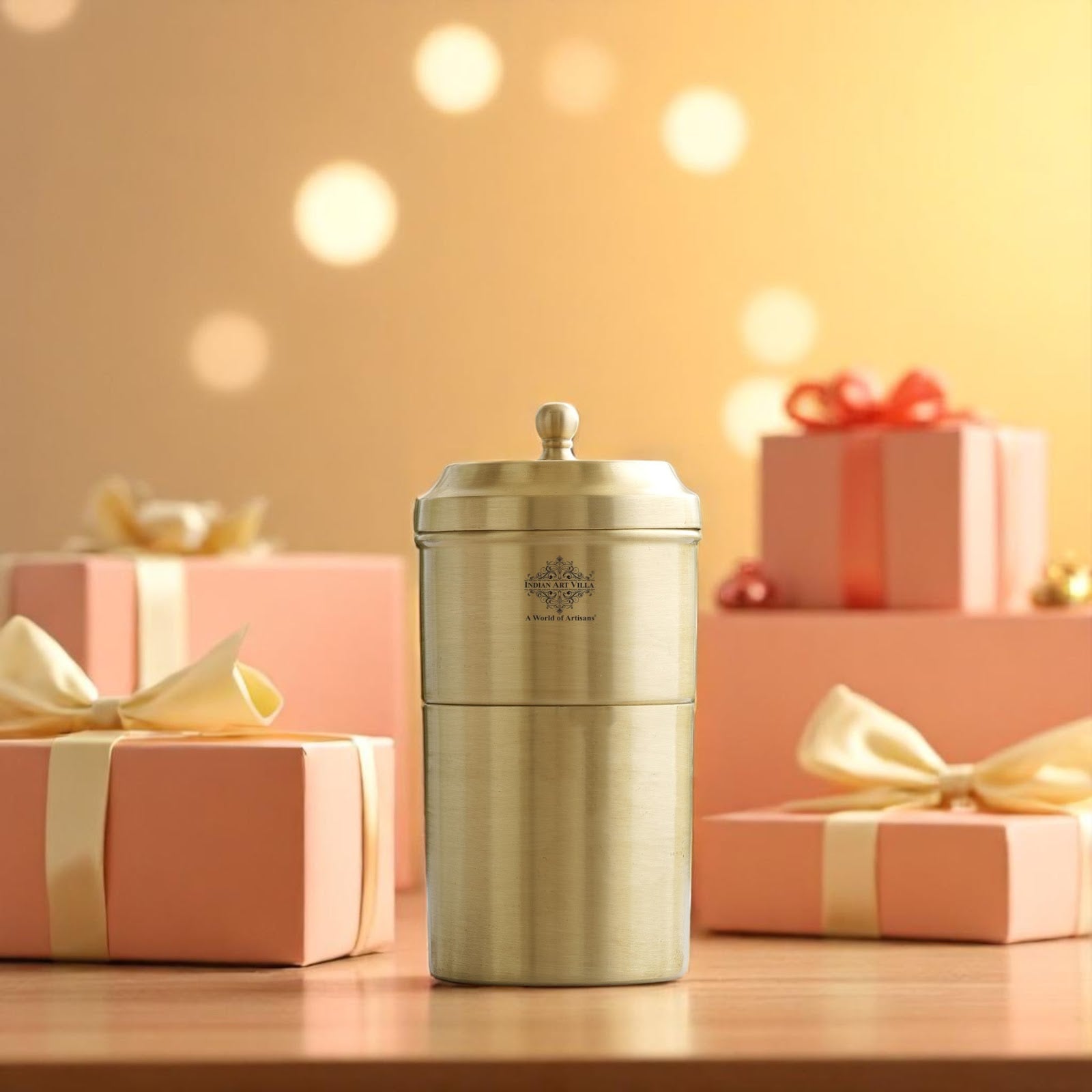 Indian Art Villa Handcrafted Pure Brass Coffee Filter with Matt Finished Design is a beautifully crafted piece that brings traditional South Indian coffee brewing into your home. Made from 100% pure brass, this medium-sized coffee filter is designed to provide an authentic coffee experience, producing rich, aromatic coffee with every brew. The filter's matt finish design adds a touch of modern elegance while maintaining its classic appeal. The smooth, matt surface not only enhances the aesthetic appeal but also ensures a comfortable grip during use. This coffee filter is perfect for those who appreciate the fine art of traditional coffee making and want to enjoy the deep, robust flavors of South Indian filter coffee. Brass, known for its excellent heat retention properties, keeps your coffee warm for longer periods, allowing you to savor each cup at your own pace. The medium size of the filter makes it ideal for small to medium servings, whether you're preparing coffee for yourself or a small group. This handcrafted coffee filter is also an eco-friendly choice, offering a sustainable alternative to disposable plastic or paper filters. Its durable construction ensures that it will be a lasting addition to your kitchen, while its easy-to-clean design makes maintenance simple.