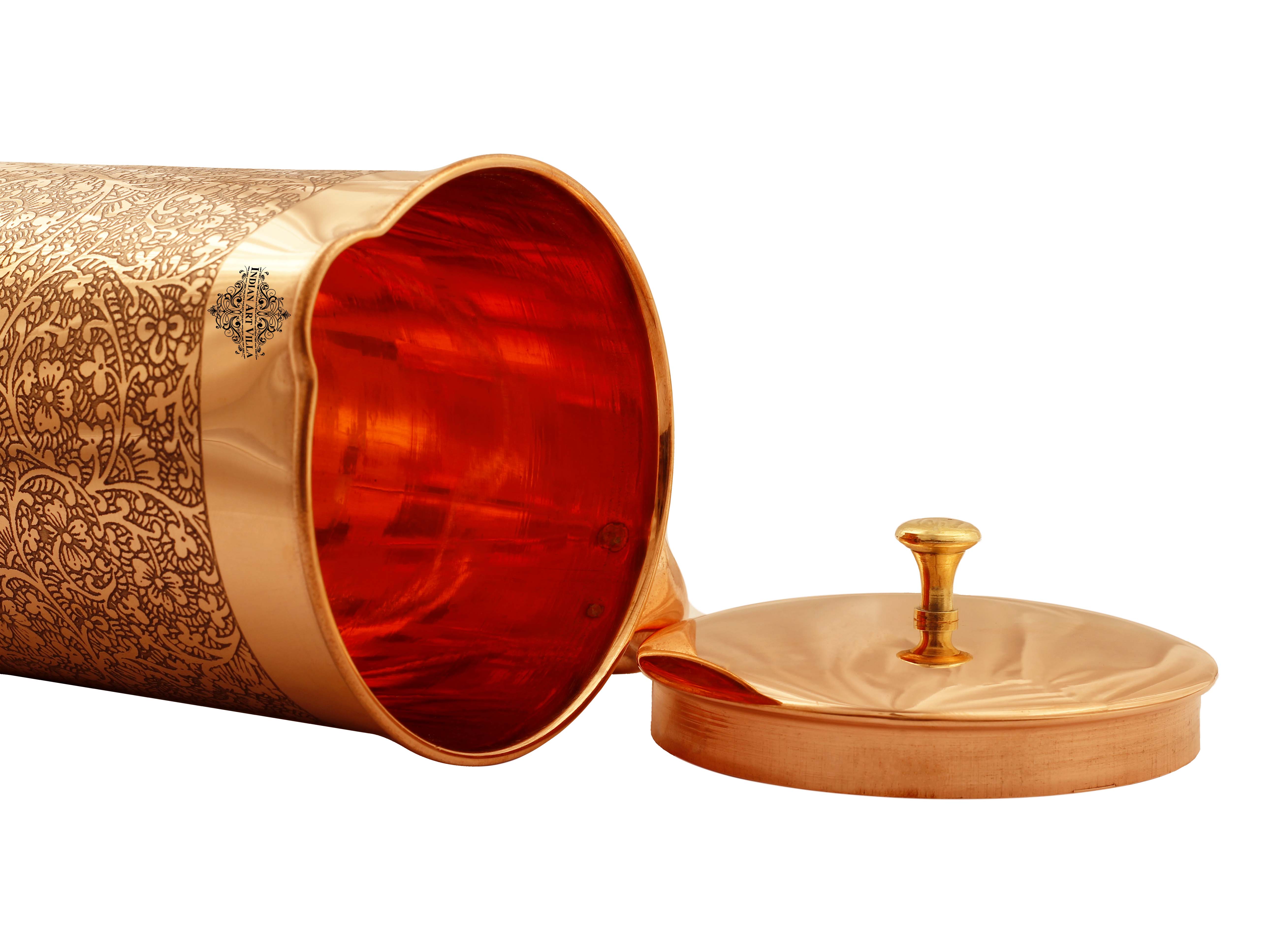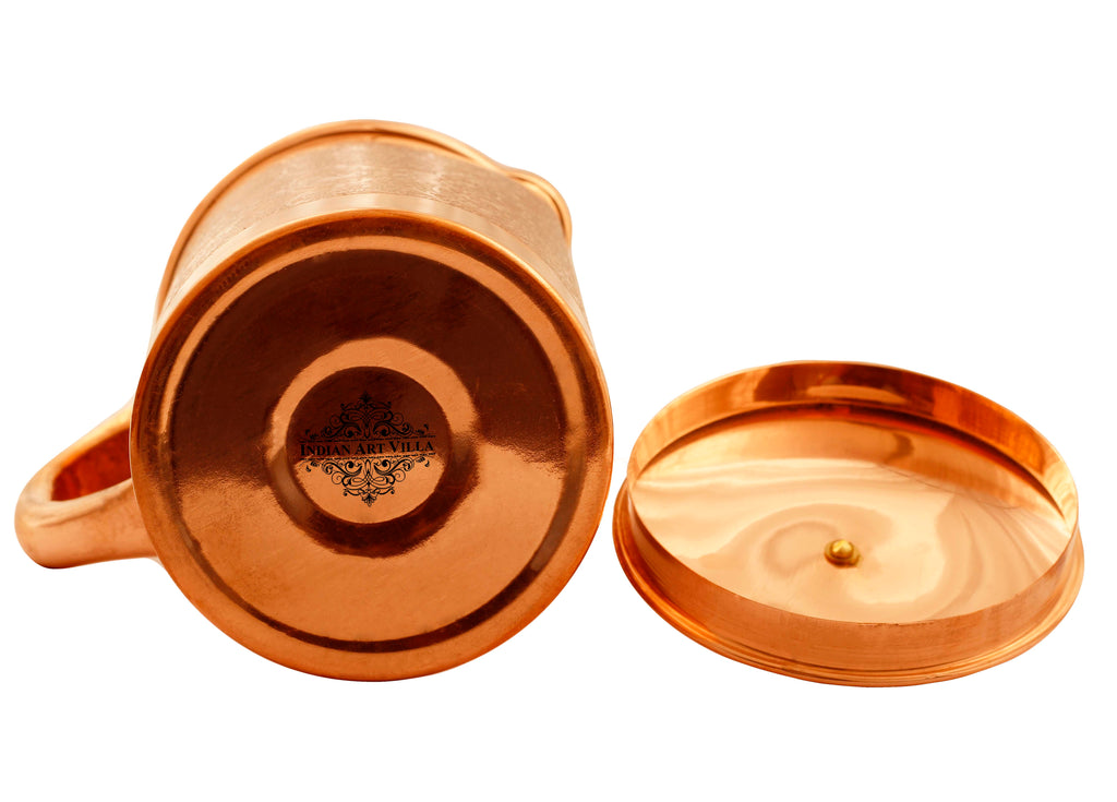 Indian Art Villa Brings Indian Art Villa Pure Copper Embossed Jug / Pitcher With Brass Knob On Lid, which can be used as tableware, Serveware, Drinkware in different volumes. We offer the best affordable prices. We also offer Easy returns & exchanges. T&C Applied. Water stored overnight in copper utensils has innumerable health benefits. It has anti-bacterial properties that help purify water & remove toxins. It aids digestion & Weight loss. It protects us from diseases like arthritis, anemia, blood pressure, hyperthyroid, and cancer and relieves us of joint pains. It has immense skin benefits too. Copper is an Antioxidant and anti-carcinogenic that prevents cell damage and slows aging. Copper is the primary element to produce melanin (pigmentation of eyes, hair, and skin) in the human body. One should make it a habit of drinking water stored in copper utensils so as to keep themselves healthy. Storing water in copper Jug is eco-friendly and hygienic. It maintains the temperature of water Longer than usual.