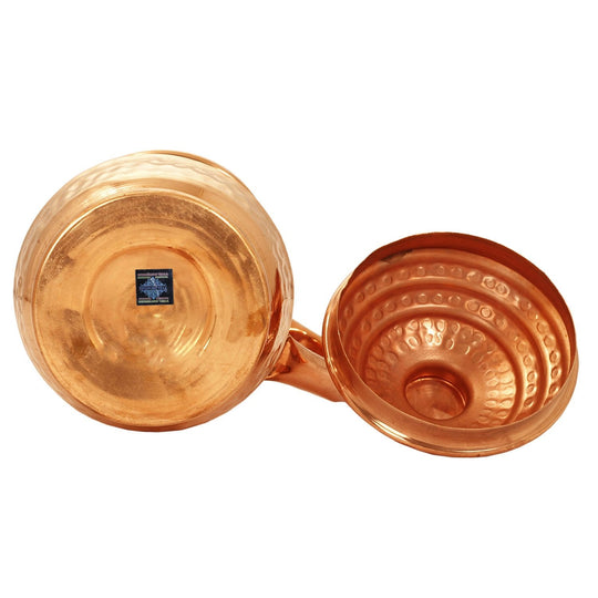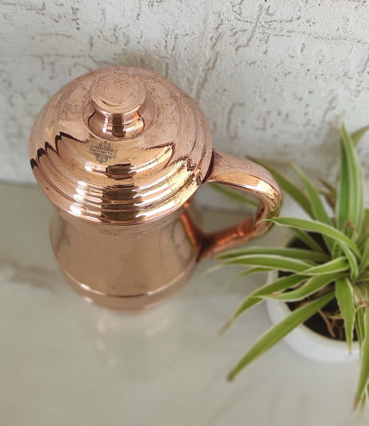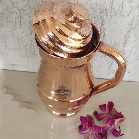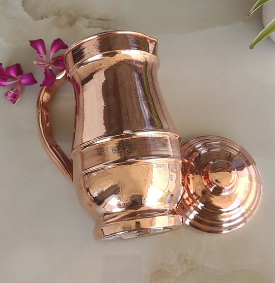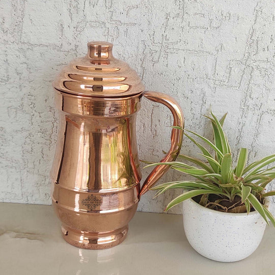 Indian Art Villa Brings Indian Art Villa Pure Copper Hammered Maharaja Style Jug / Pitcher With Lid, which can be used as tableware, Serveware, Drinkware in different volumes. We offer the best affordable prices & Free Shipping PAN India. We also offer Easy returns & exchanges. T&C Applied. Water stored overnight in copper utensils has innumerable health benefits. It has anti-bacterial properties that help purify water & remove toxins. It aids digestion & Weight loss. It protects us from diseases like arthritis, anemia, blood pressure, hyperthyroid, and cancer and relieves us of joint pains. It has immense skin benefits too. Copper is an Antioxidant and anti-carcinogenic that prevents cell damage and slows aging. Copper is the primary element to produce melanin (pigmentation of eyes, hair, and skin) in the human body. One should make it a habit of drinking water stored in copper utensils so as to keep themselves healthy. Storing water in a copper Jug is eco-friendly and hygienic. It maintains the temperature of water Longer than usual.