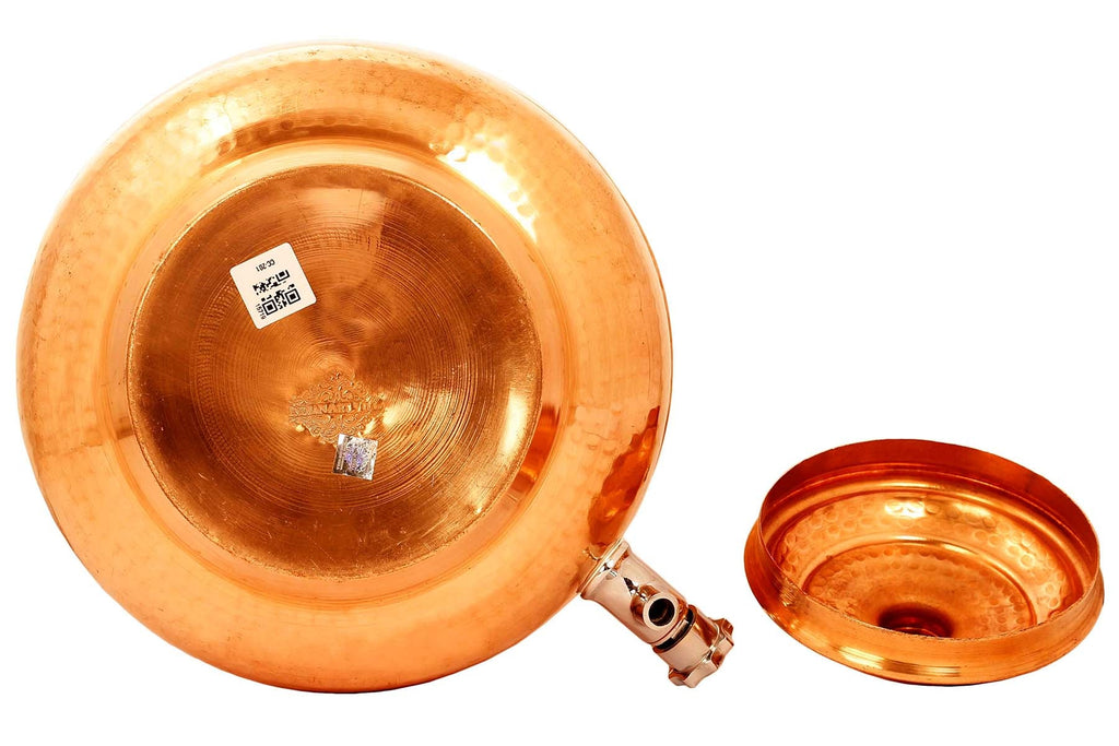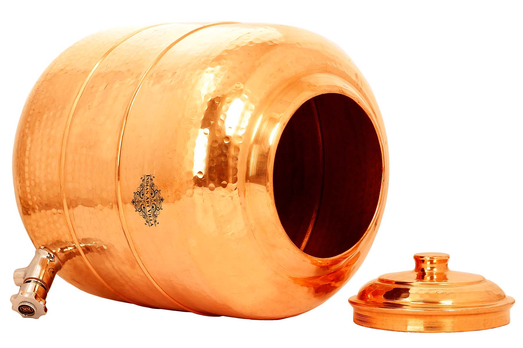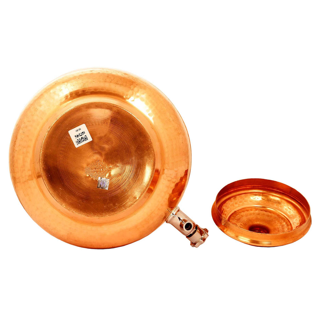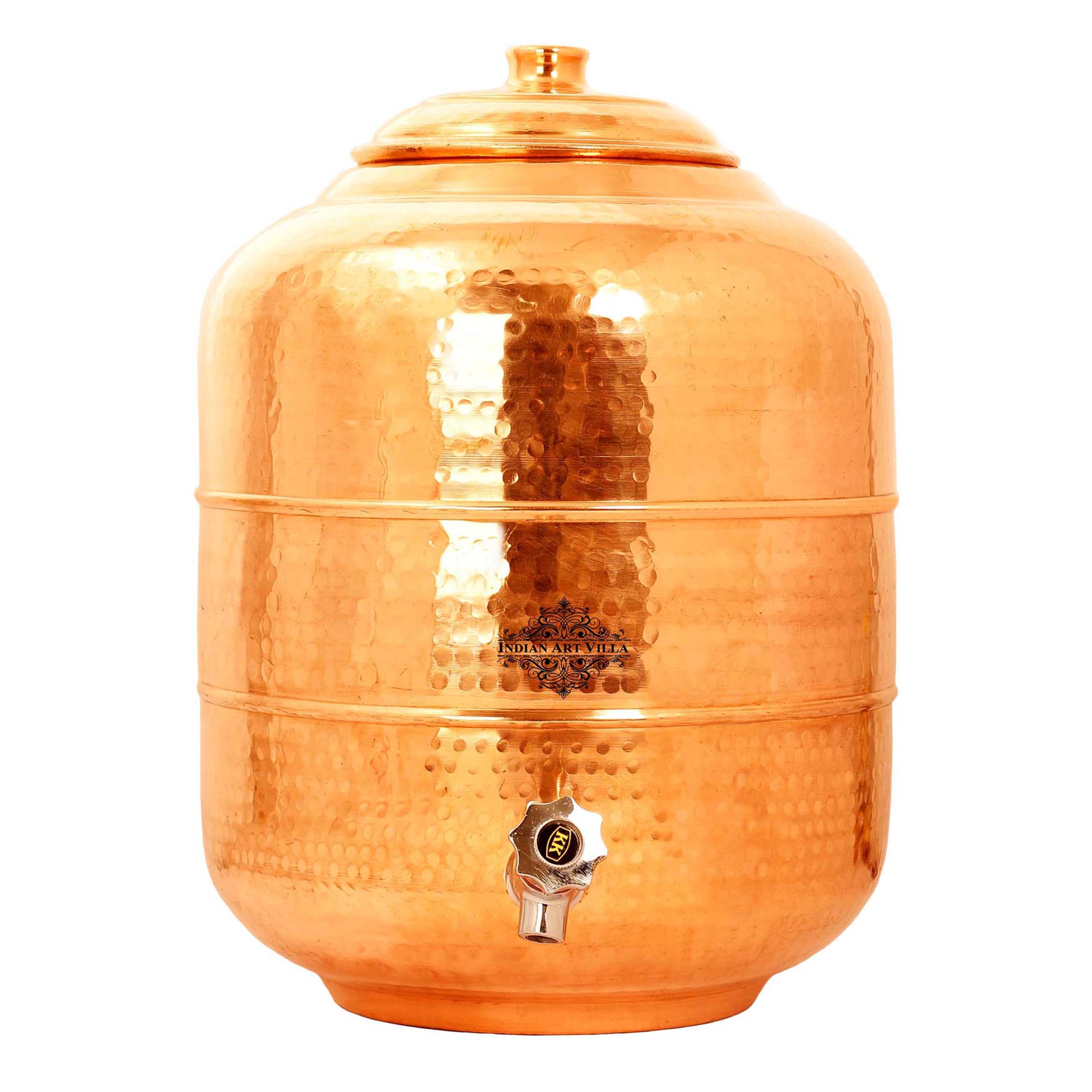 Indian Art Villa Brings Pure Copper Hammered Design Water Pot Container. We offer the best affordable prices. We also offer Easy returns & exchanges. T&C Applied. Water stored overnight in copper utensils has innumerable health benefits. It has anti-bacterial properties that help purify water & remove toxins. It aids digestion & Weight loss. It protects us from diseases like arthritis, anemia, blood pressure, hyperthyroid, cancer and relieves us of joint pains. It has immense skin benefits too. Copper is an Antioxidant and anti-carcinogenic that prevents cell damage and slows aging. Copper is the primary element to produces melanin (pigmentation of eyes, hair, and skin) in the human body. One should make it a habit of drinking water stored in copper utensils so as to keep themselves healthy. Storing water in copper Water Pot is eco-friendly and hygienic. It maintains the temperature of water Longer than usual. Indian Art Villa Copper items have antique designs. The item is highly durable, elegant, and a wonderful addition to your Home Décor.