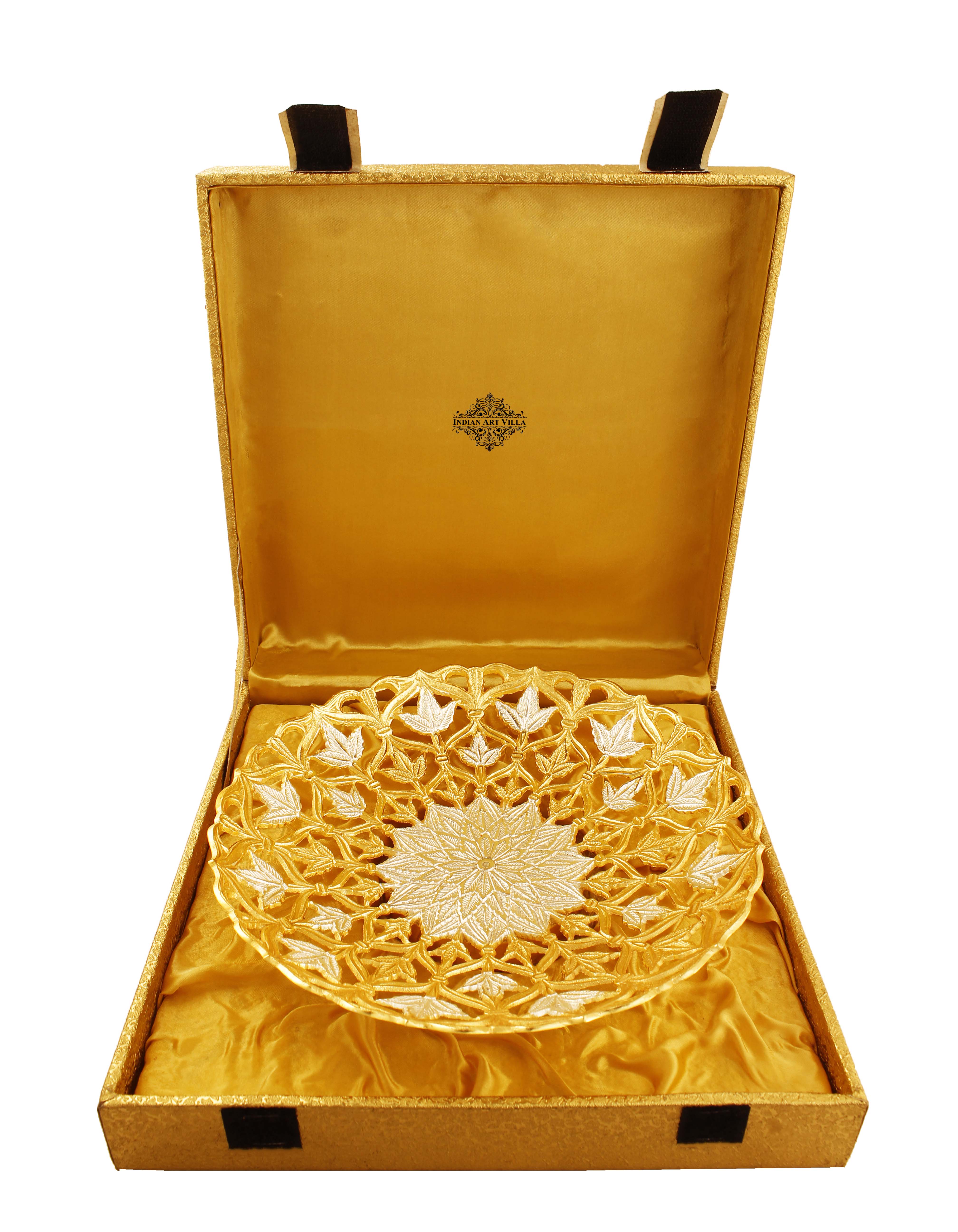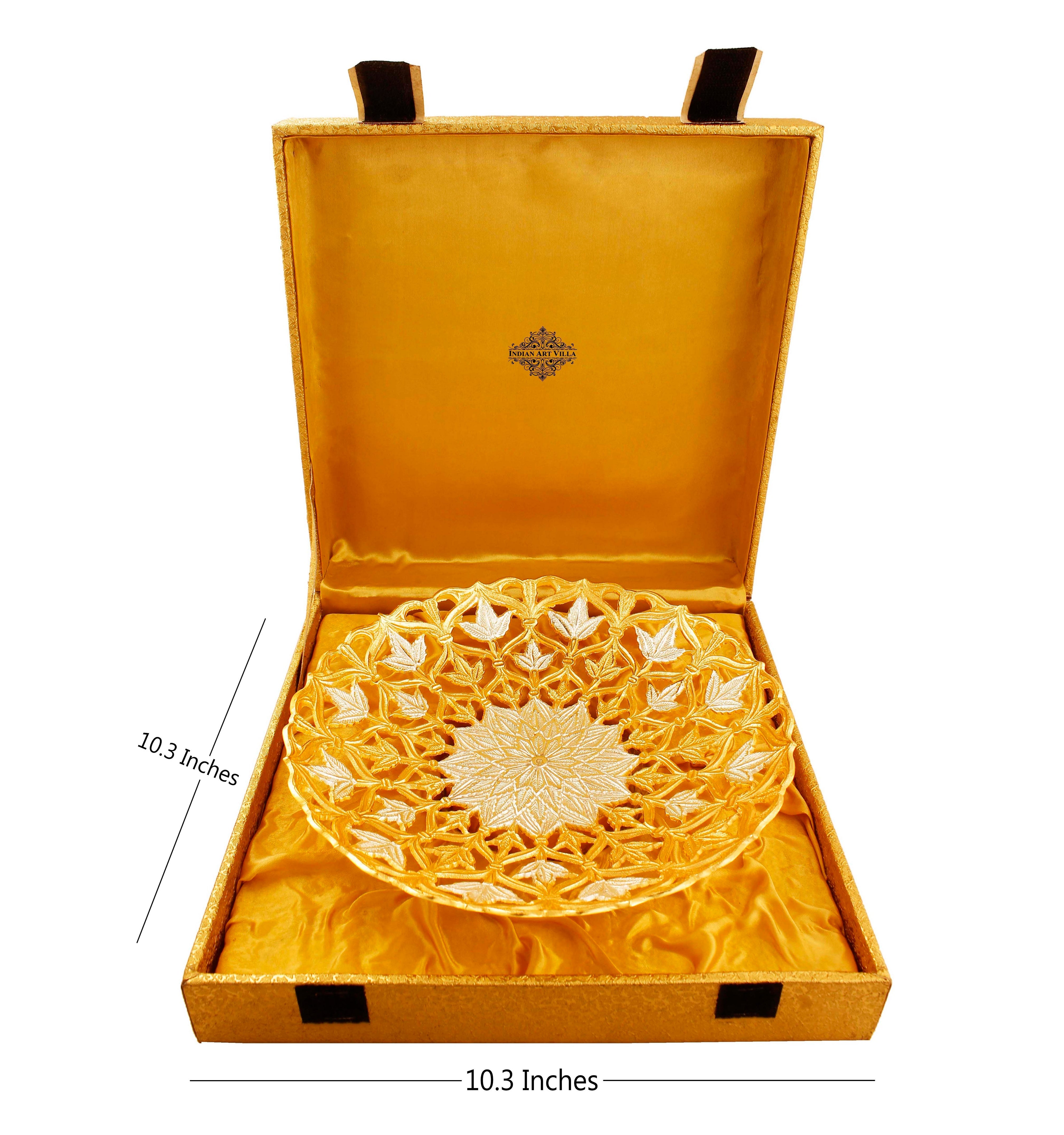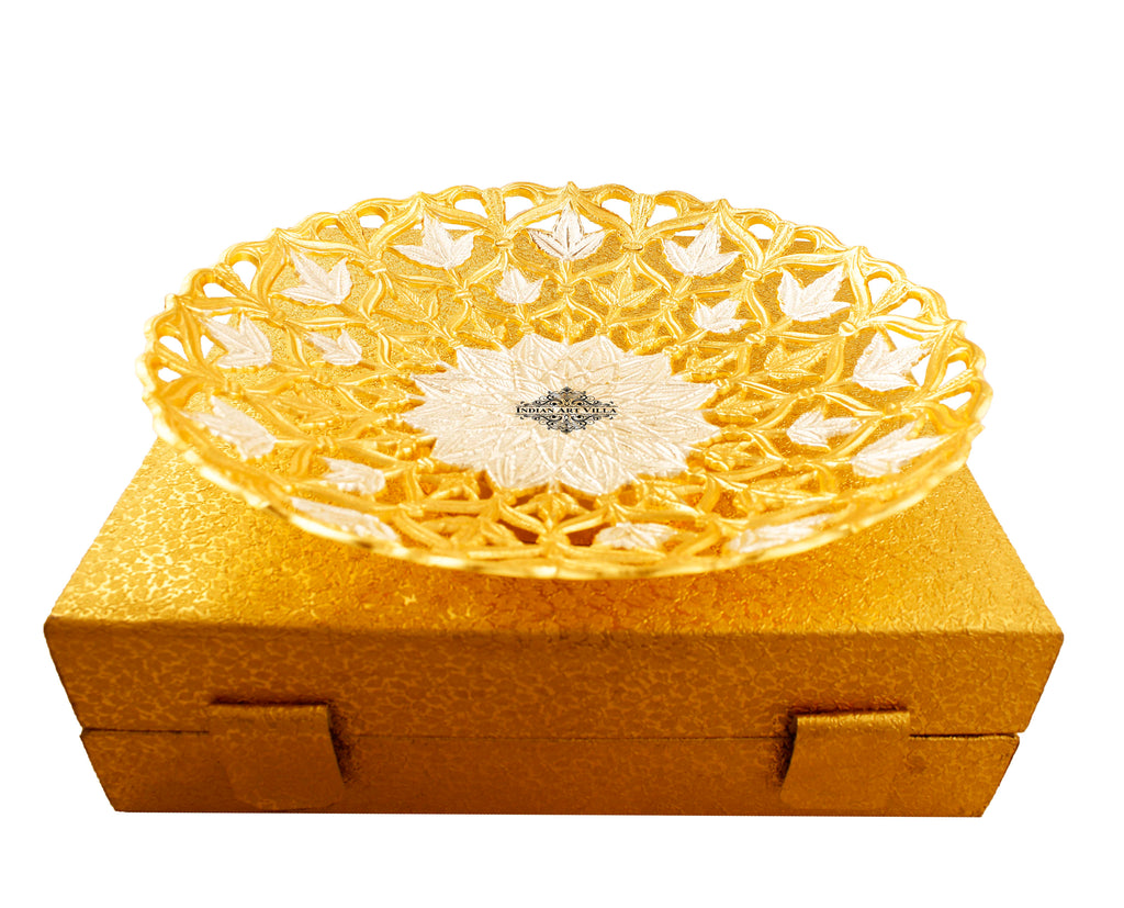 IndianArtVilla Silver & Gold Plated Jali Cut Leaf Design Fruit Centre Table Bowl, Decorative Platter, Gift Set