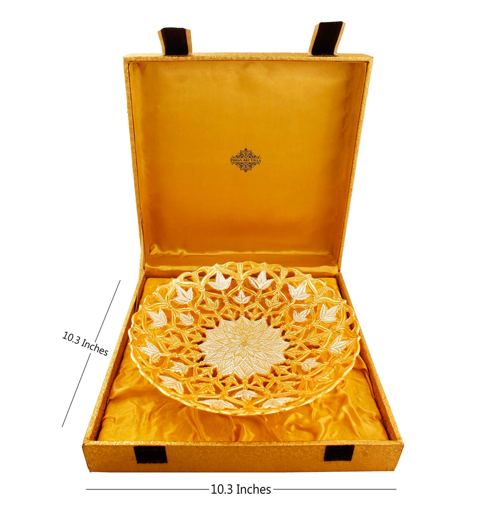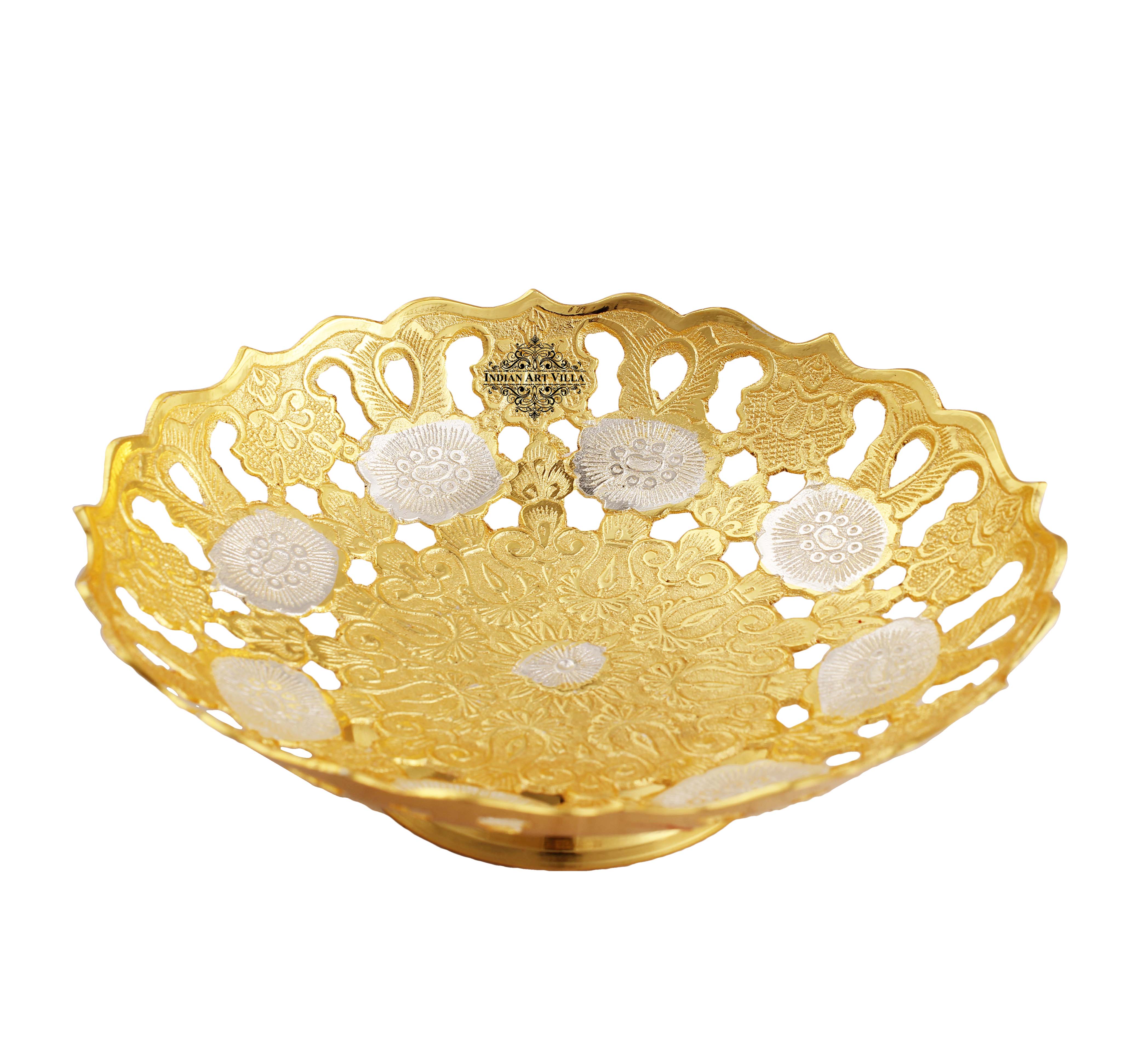Indian Art Villa Pure Silver & Gold Plated Jali Cut Leaf Design Fruit Centre Table Bowl. We offer the best affordable prices. This Beautiful Pure Silver & Gold Plated Jali Cut Leaf Design Fruit Centre Table Bowl can be used as a home decor item or they can also be gifted to your near and dear ones. Also, Make your home more lively and cheerful with this brilliant decor piece. Designed to accentuate the beauty and ambiance it brings soothing vibes to your abode and raises its contemporary look manifolds. It is sheer elegance and contemporary in look. It is durable and sturdy and with proper cleaning will shine as new every time. IndianArtVilla Silver Gold Plated items have antique designs. The item is highly durable, elegant, and a wonderful addition to your Home Decor.