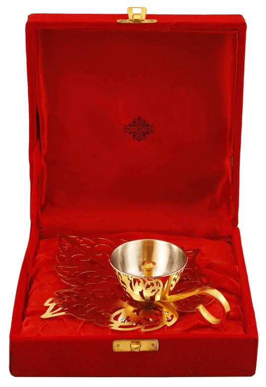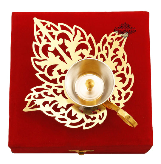 Indian Art Villa Pure Silver & Gold Plated Leaf Design Akhand Diya is a magnificent piece of artistry, perfectly blending traditional craftsmanship with contemporary design. This exquisite oil lamp is thoughtfully created for sacred ceremonies like puja, aarti, and poojan at temples or homes. Crafted with precision, the Diya showcases a striking leaf design, adorned with intricate silver and gold plating, adding an opulent touch to any religious setting. The akhand Diya's seamless construction ensures a continuous and steady flame, symbolizing the eternal presence of the divine. The Diya also features a convenient handle, allowing easy mobility and safe handling while performing rituals. Its radiant glow not only illuminates the surroundings but also imparts a sense of spiritual serenity to the ambiance. A testament to India's rich cultural heritage, this Pure Silver & Gold Plated Akhand Diya is more than just a functional item; it stands as a cherished symbol of devotion and reverence, perfect for enhancing the spiritual experience during prayer and worship.